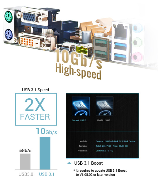 Zwei namensgebende USB-3.1-Anschlüsse vom Typ-A repräsentieren die Innovation der Asus Z97-DELUXE/USB 3.1. Ultraschnelle Übertragungsraten von bis zu 10Gb/s sind durch diesen Standard möglich. Das bedeutet doppelte Geschwindigkeit gegenüber USB 3.0. Darüber hinaus ist diese Art USB vollständig abwärtskompatibel. Durch die exklusive ASUS USB 3.1 Boost Technologie wird die Leistung sogar nochmal erweitert. Das alles ist allerdings nur der Anfang einer langen Reihe beeindruckender Features. Mittels SATA Express erreicht die Karte auch im Bereich Festspeicher eine Datenübertragungsrate von bis zu 10 Gbits/s. Auch dieser Standard ist abwärtskompatibel für bis zu zwei SATA-Laufwerke. M.2 setzt die enorme Geschwindigkeit der Datenübertragung von bis zu 10 Gbits/s auch das komplette System betreffend fort. Weiterhin besteht die Möglichkeit, das System mit Thunderbolt-2-Erweiterungskarten aufzurüsten und so von bidirektionalen Übertragungsraten von bis zu 20 Gbit/s zu profitieren, also von vierfacher Geschwindigkeit gegenüber USB 3.0. Kombiniert mit 4K/UHD-Monitoren können Sie Filme in gestochen scharfen Details genießen. TPU hilft Ihnen, Leistung und Potential der Grafikkarte optimal auszureizen. Die EPU sorgt für eine bestmögliche Energieeffizienz. Mit Fan Xpert 3 wird eine Schaltzentrale für CPU- und Gehäuselüfter angeboten, die für eine perfekte Kühlung sorgt. Direkt fürs Gaming extrem interessant ist die Turbo App, ein intuitives Tuning-Panel, mit dem Sie sich erhebliche Vorteile beim Spielen verschaffen können. Übertakten Sie die CPU, setzen Sie Prioritäten auf die Datenübertragung von Spielen und stimmen Sie die Audioeinstellungen perfekt auf Ihre eigenen Wünsche ab. Letztere lassen sich mittels Crystal Sound 2 hinsichtlich Aktivität ebenfalls optimal einstellen, je nachdem, ob Sie Gespräche führen, Filme oder Ihre Lieblingsmusik genießen. Weiterhin werden Interferenzen reduziert, Störsignale abgeschirmt und Knackgeräusche verhindert.