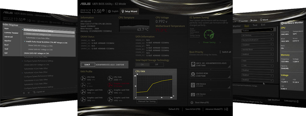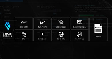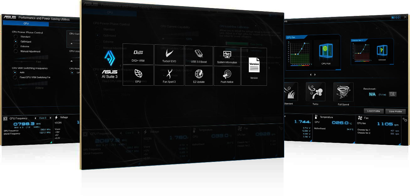 Die ASUS AI Suite 3 verfügt über eine überarbeitete, übersichtlich und ansprechend gestaltete Oberfläche mit Unterstützung für große Monitore. Sie bündelt alle exklusiven ASUS-Funktionen an einer Stelle, an der Sie Übertaktungseinstellungen, Energieverbrauch, Lüfterdrehzahlen, Spannungswerte und andere Parameter verfolgen können. Das Komplettpaket fasst damit vielfältige, einfach bedienbare Funktionen zusammen, die sonst auf mehrere Dienstprogramme verteilt sind.