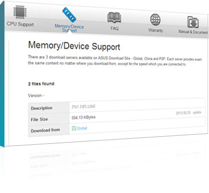 Jedes ASUS-Mainboard der 9er-Serie ist mit Tausenden von Geräten kompatibel. Unsere Ingenieure testen die Mainboards mit CPUs aus dem Server- und Consumer-Bereich, mit Hunderten von Speichermodulen, Dutzenden von Grafikkarten sowie diversen Speichergeräten, Netzteilen, Netzwerkkarten, Displays, optischen Laufwerken, Peripheriegeräten und mehr. Wir möchten, dass Sie volles Vertrauen in unsere Produkte und ihre überragende Kompatibilität haben.