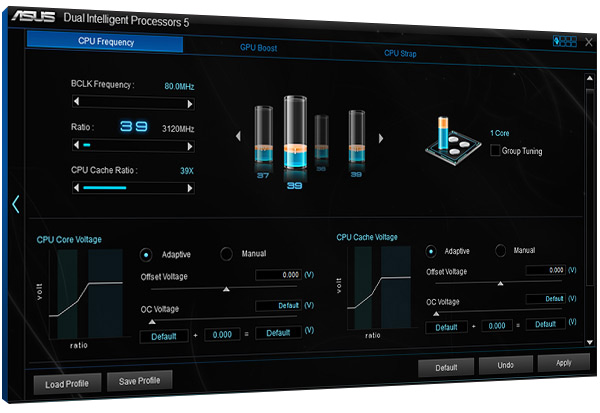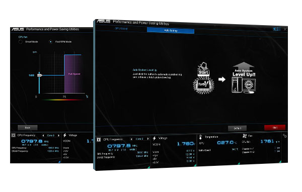 Nutzen Sie die volle Leistung Ihres PC mit einem einfachen, zweistufigen Schalter oder der ASUS AI Suite 3. Die TPU (Turbo Processor Unit) ermöglicht eine präzise Spannungsregelung und die Überwachung von CPU und Grafikkarte. Sie gibt Ihnen die Freiheit, CPU-Taktfrequenzen und den Multiplikator so anzupassen, dass Sie die Leistung und das Potenzial Ihrer Grafikkarte* voll ausschöpfen können.
