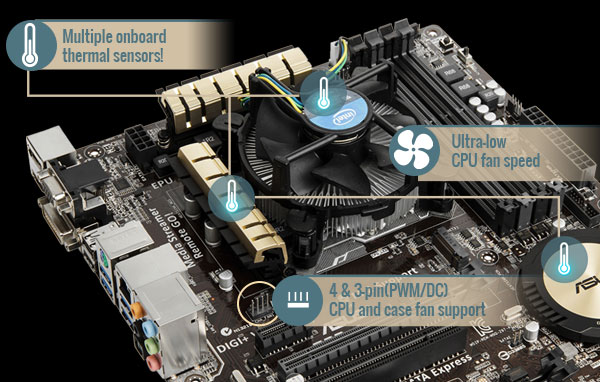 Mit der EPU (Energy Processing Unit) profitieren Sie von Echtzeit-Energieeinsparungen, die mit einem einfachen Schalter oder der AI Suite 3 gesteuert werden. Die EPU passt die Leistungsaufnahme vollautomatisch an die Nutzung des PCs an. Zudem kann Sie den Stromverbrauch des Prozessors auf einen bestimmten Wert absenken oder im „Away Mode“ noch mehr Strom sparen: In diesem Modus werden nicht genutzte Controller abgeschaltet und Grafikkarten in den Stromsparmodus versetzt. In Ihrer Abwesenheit verbraucht der PC also nur so viel Strom, wie er unbedingt benötigt.