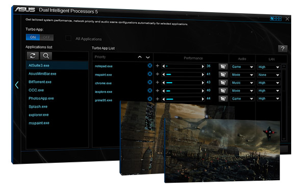 Komplexes Systemtuning mit einem Klick: Die 5-fach-Optimierung von ASUS macht aus Ihrem System einen intelligenten PC. Wichtige Parameter werden in Echtzeit dynamisch optimiert. Sie profitieren von exzellenter CPU-Leistung, Energieeinsparungen im Alltag, besonders stabiler digitaler Spannungsregelung und leiser Systemkühlung. Und jetzt werden auch Netzwerk- und Audioeinstellungen an Ihre Anwendungen angepasst. Mit der 5-fach-Optimierung ist Ihr PC für alles gerüstet – von Gaming über Unterhaltung bis hin zu Produktivitätsanwendungen.