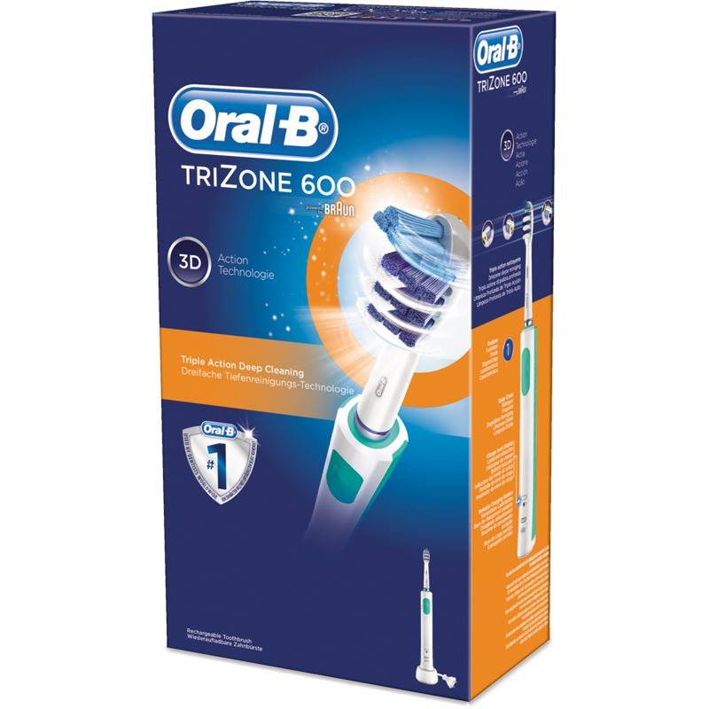 Die Oral-B TriZone 600 entfernt bis zu 100% mehr Plaque als eine herkömmliche Handzahnbürste. Eine visuelle Andruckkontrolle warnt bei Putzen mit zu viel Druck. Mit 20.000 Pulsationen und 8.800 Seitwärtsbewegungen pro Minute sorgt die TriZone 600 für eine effiziente und wirksame Reinigung des gesamten Mundraumes und sorgt somit für ein sauberes Mundgefühl.