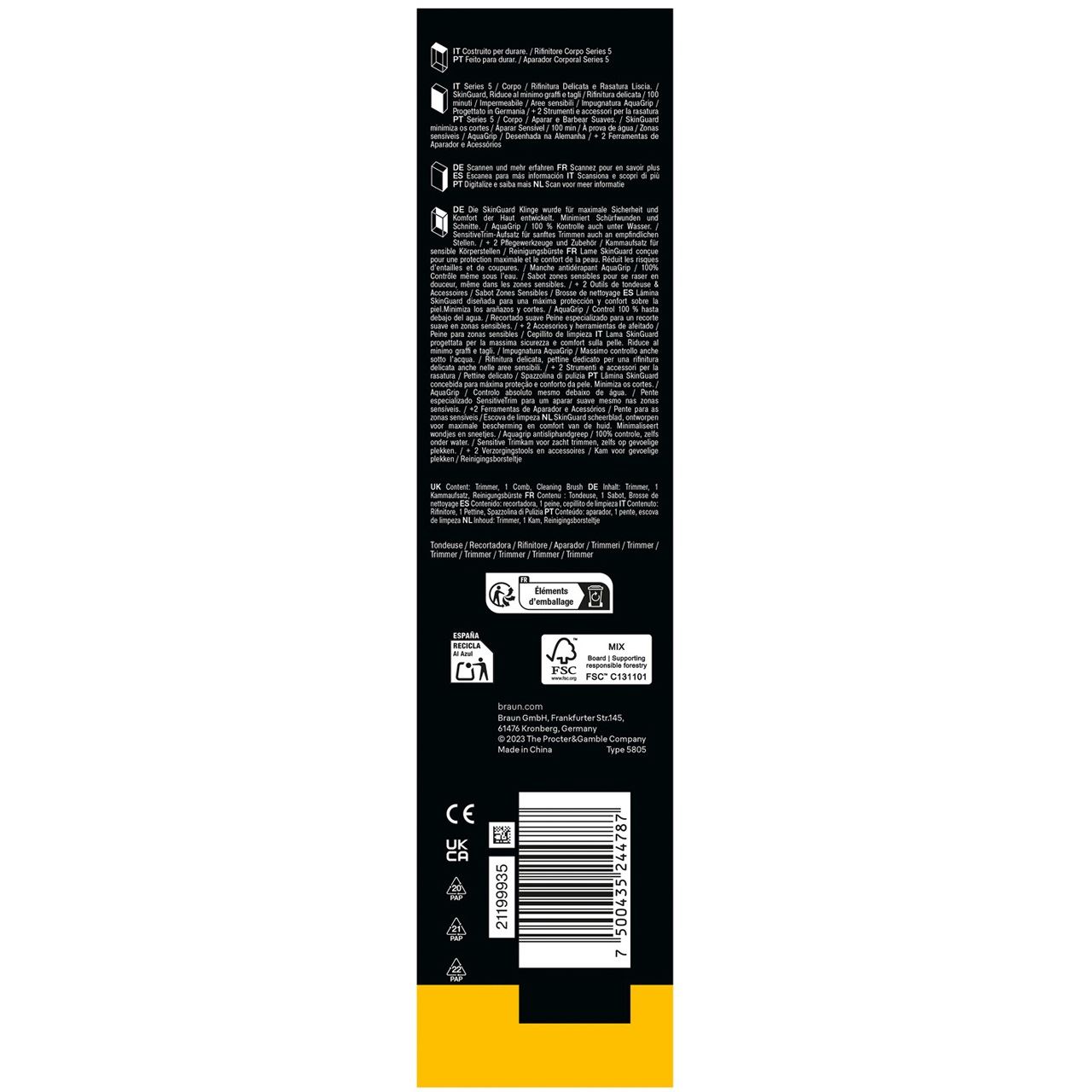 Braun Series 5 BG5500. Produktfarbe: Grau, Weiß, Trim-Aufsatz: Body-Trimmer. Energiequelle: Akku, Akku-/Batterietechnologie: Lithium-Ion (Li-Ion), Akku-/Batterietyp: Integrierte Batterie. Breite: 42 mm, Tiefe: 41 mm, Höhe: 156 mm. Verpackungsart: Box