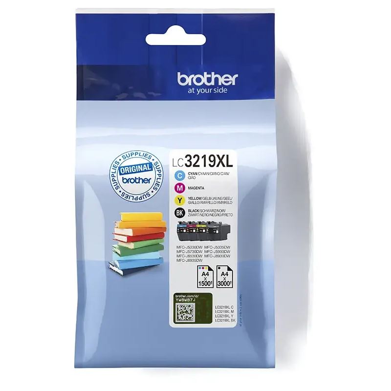 Brother LC3219XLVAL. Versorgungstyp: Multipack, Seitenergebnis Farbtinte: 1500 Seiten, Druckfarben: Schwarz, Cyan, Magenta, Gelb, Menge pro Packung: 4 Stück(e), Seitenergebnis schwarze Tinte: 3000 Seiten