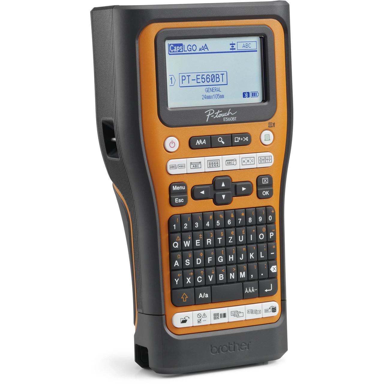 Brother PT-E560BTVP. Drucktechnologie: Wärmeübertragung, Maximale Auflösung: 180 x 180 DPI, Druckgeschwindigkeit (metrisch): 20 mm/sek. Übertragungstechnik: Verkabelt & Kabellos, Bluetooth, Bluetooth-Version: 5.0, USB Anschluss. Tastaturaufbau: QWERTZ. Bandtyp: HSE/TZe. Produktfarbe: Schwarz, Orange
