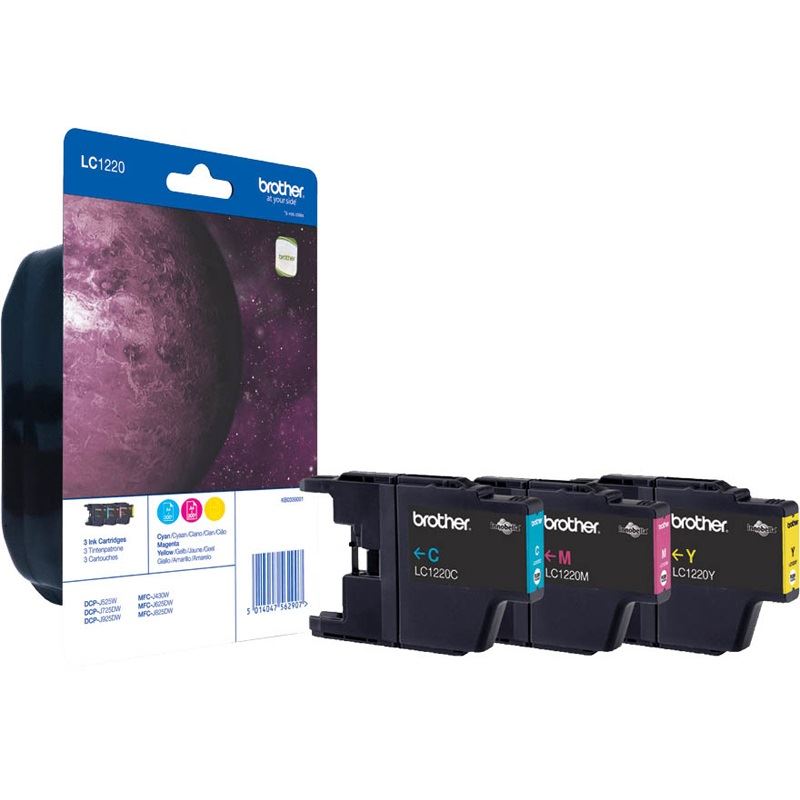 Brother LC1220RBWBP. Farbiger Tintentyp: Tinte auf Pigmentbasis, Versorgungstyp: Multipack, Seitenergebnis Farbtinte: 300 Seiten, Druckfarben: Cyan, Magenta, Gelb, Menge pro Packung: 3 Stück(e)