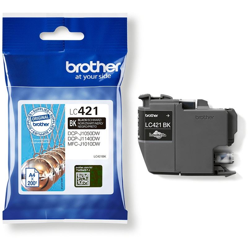 Brother LC421BK. Versorgungstyp: Einzelpackung, Seitenergebnis Farbtinte: 0 Seiten, Druckfarben: Schwarz, Menge pro Packung: 1 Stück(e), Seitenergebnis schwarze Tinte: 200 Seiten