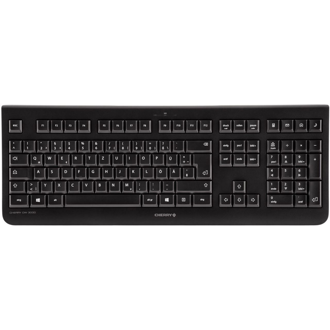 CHERRY DW 3000. Tastatur Formfaktor: Volle Größe (100%). Tastatur-Stil: Gerade. Übertragungstechnik: Kabellos, Geräteschnittstelle: RF Wireless, Tastaturaufbau: QWERTY, Tastatur - Tastenanzahl: 108, Empfohlene Nutzung: Universal. Produktfarbe: Schwarz. Maus enthalten