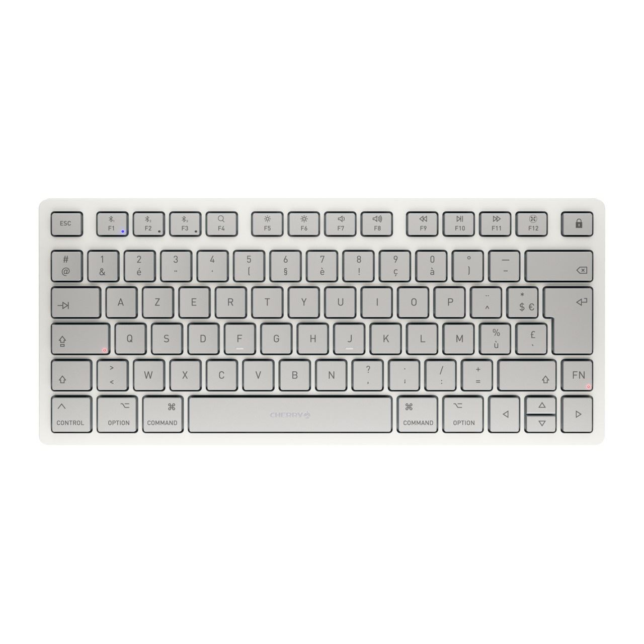 CHERRY KW 7100 MINI BT for MAC. Tastatur Formfaktor: 75%. Tastatur-Stil: Gerade. Übertragungstechnik: Kabellos, Geräteschnittstelle: Bluetooth, Tastatur-Switch: Scherenschalter, Tastaturaufbau: AZERTY, Tastatur - Tastenanzahl: 79, Empfohlene Nutzung: Haus. Produktfarbe: Weiß