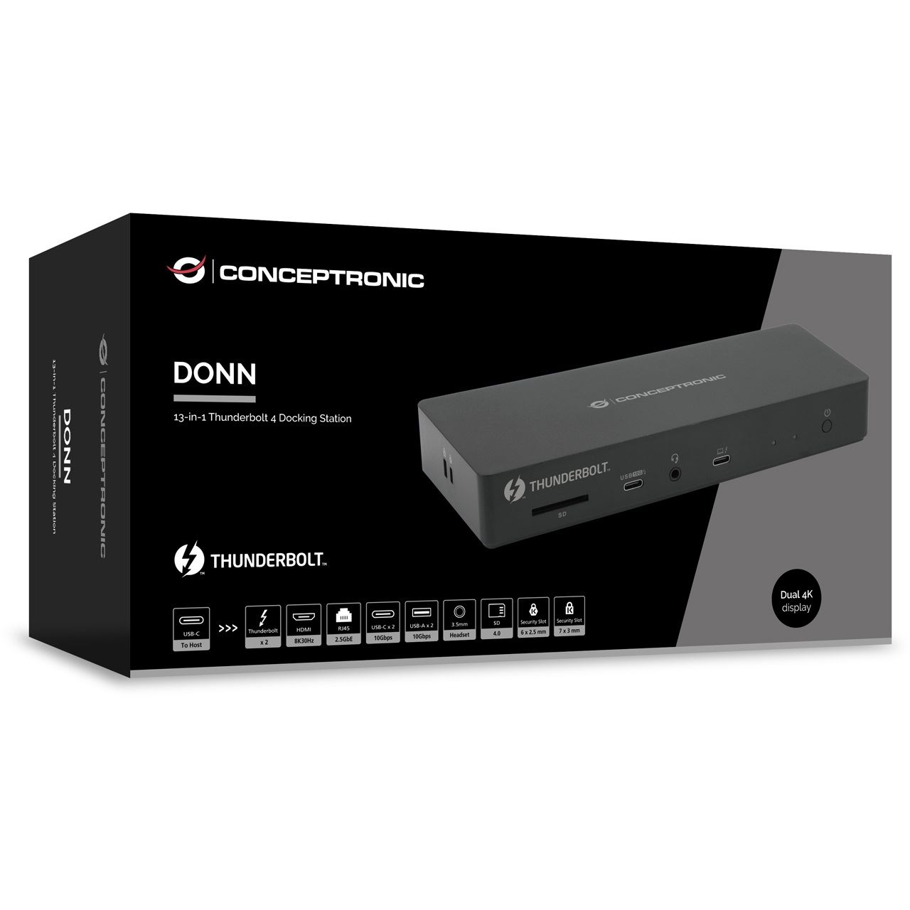 Conceptronic DONN30B 13-in-1 Thunderbolt 4 Dockingstation. Übertragungstechnik: Kabelgebunden, Hostschnittstelle: Thunderbolt 4, USB-Stromversorgung bis zu: 96 W. Ethernet LAN Datentransferraten: 10,100,1000,2000,2500 Mbit/s, Netzstandard: IEEE 802.3bz. Produktfarbe: Schwarz, Kompatible Speicherkarten: SD, SDHC, SDXC, Datenübertragungsrate: 40 Gbit/s. Unterstützt Windows-Betriebssysteme: Windows 10, Windows 10 Education, Windows 10 Education x64, Windows 10 Enterprise, Windows 10..., Unterstützt Mac-Betriebssysteme: Mac OS X 11.0 Big Sur, Mac OS X 12.0 Monterey, Mac OS X 13.0 Ventura, Mac OS X 14.0 Sonoma, Mac OS.... Breite: 199 mm, Tiefe: 74,8 mm, Höhe: 31 mm