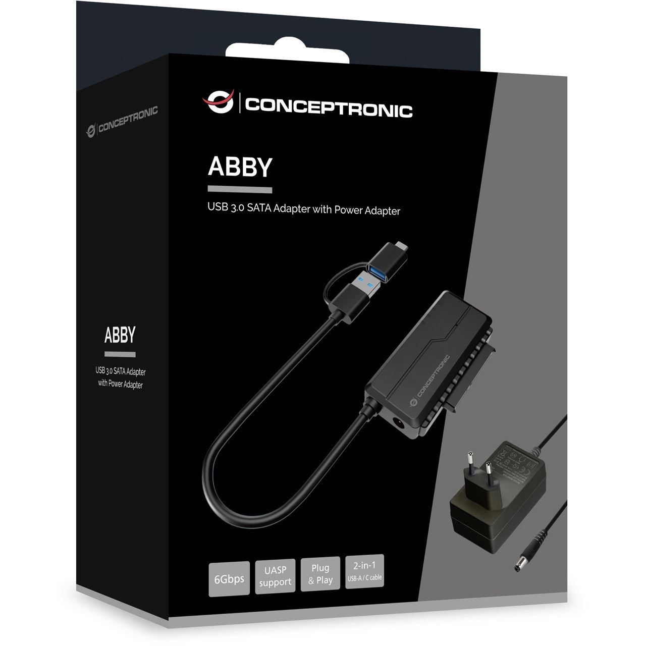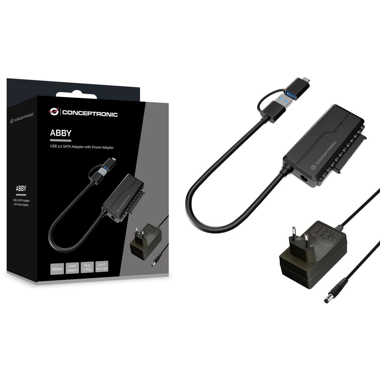 Conceptronic ABBY21B USB 3.0 SATA-Adapter mit Netzteil, 2,5"/3,5" SATA HDD/SSD, 2-in-1 USB C/A-Kabel. Anschluss 1: USB Type-A, Anschluss 2: SATA 22-pin. Produktfarbe: Schwarz