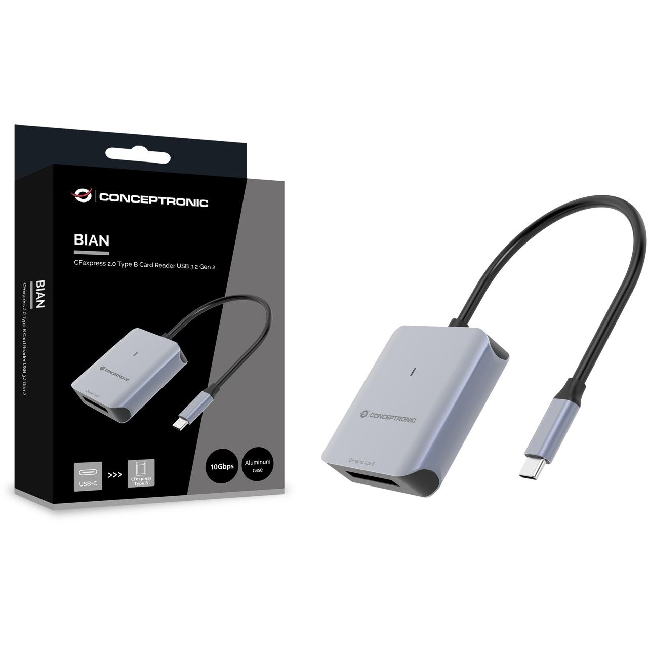 Conceptronic BIAN08G CFexpress 2.0 Typ B Kartenleser USB 3.2 Gen 2. Kompatible Speicherkarten: CFexpress 2.0 Type B, Produktfarbe: Grau, Datenübertragungsrate: 10000 Mbit/s. Schnittstelle: USB 3.2 Gen 2 Type-C. Energiequelle: USB. Breite: 64 mm, Tiefe: 60 mm, Höhe: 15 mm. Verpackungsbreite: 150 mm, Verpackungstiefe: 108 mm, Verpackungshöhe: 120 mm