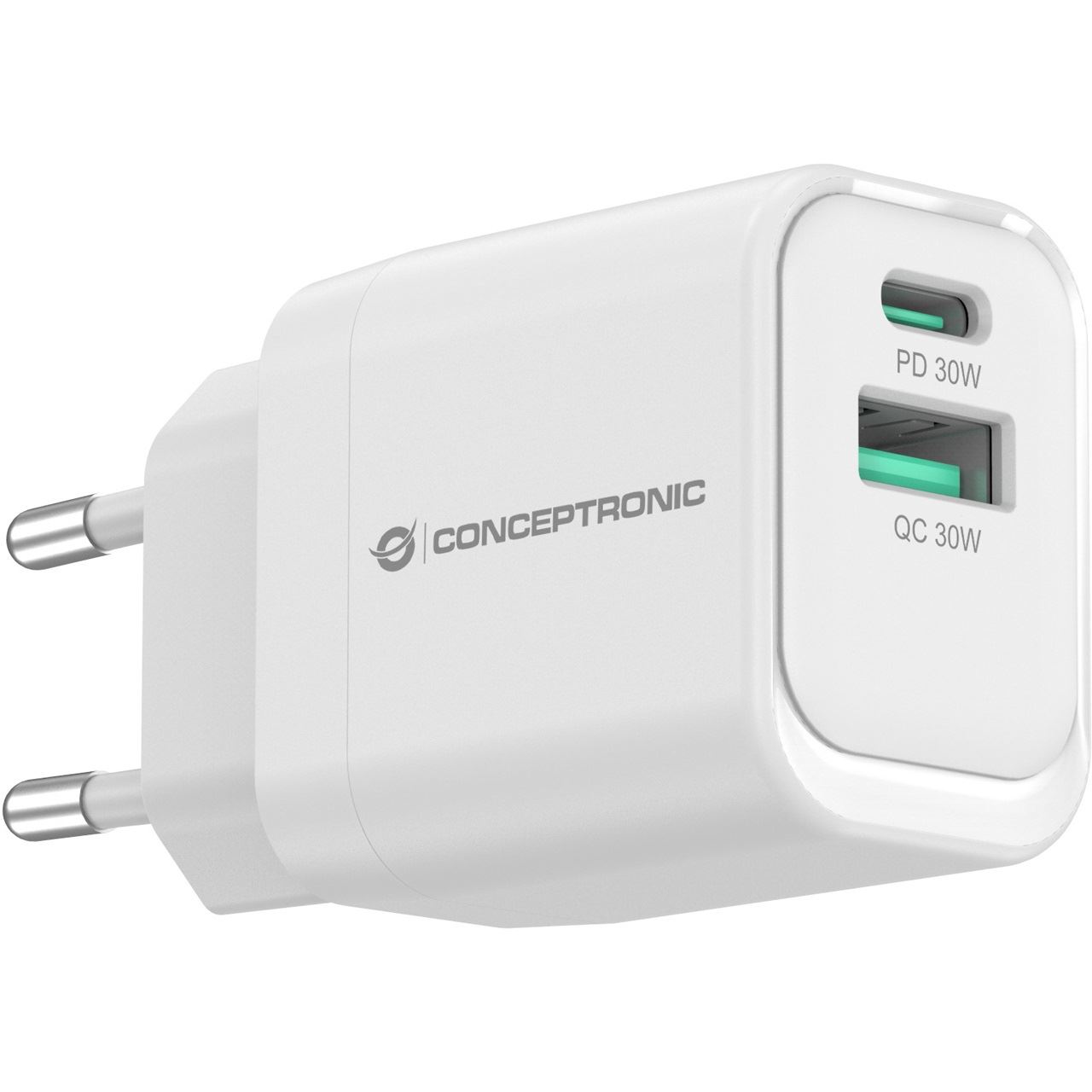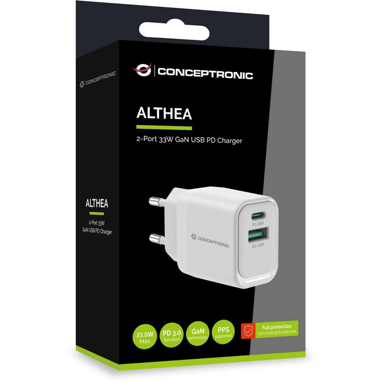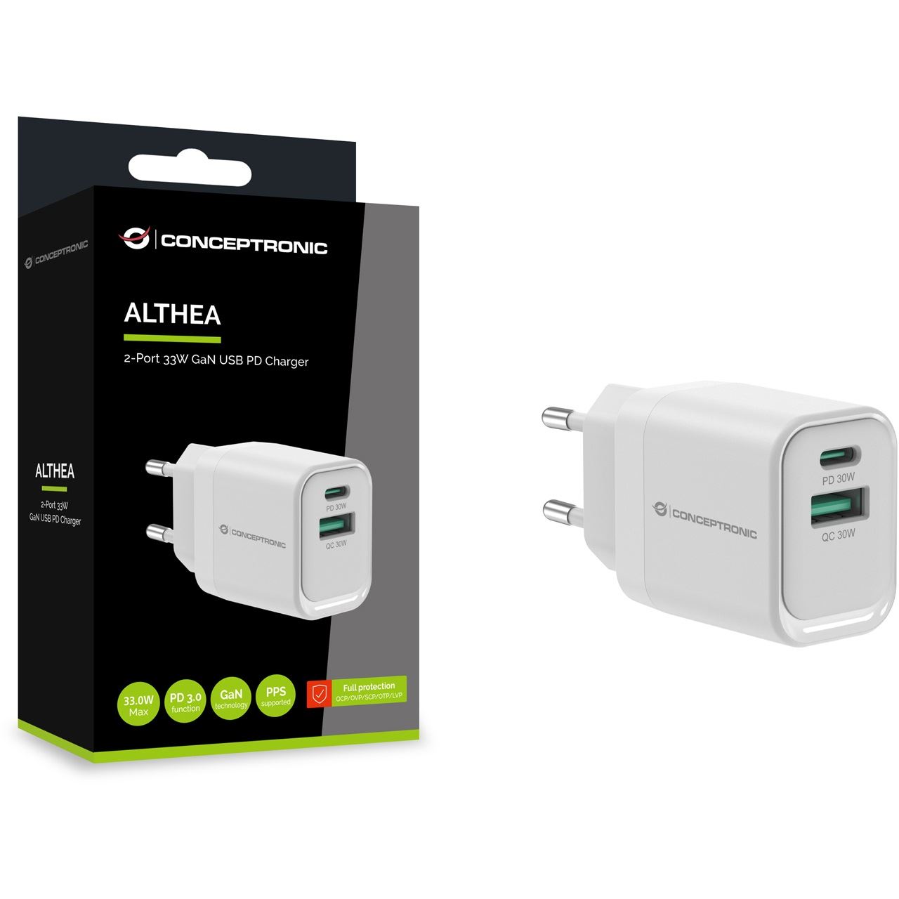 Conceptronic ALTHEA19W33 2-Port 33W GaN USB-PD-Ladegerät, USB-C x 1, USB-A x 1, QC 3.0, PPS, PD 3.0. Aufladetyp: Drinnen, Energiequelle: AC, Aufladekompatibilität: Universal. Eingangsspannung: 100 - 240 V, Maximale Ausgangsspannung: 20 V. USB Typ-C Anzahl Anschlüsse: 1, Schnellladung, Energieschutzeigenschaften: Überhitzung, Überlastschutz, Kurzschluß. Produktfarbe: Weiß