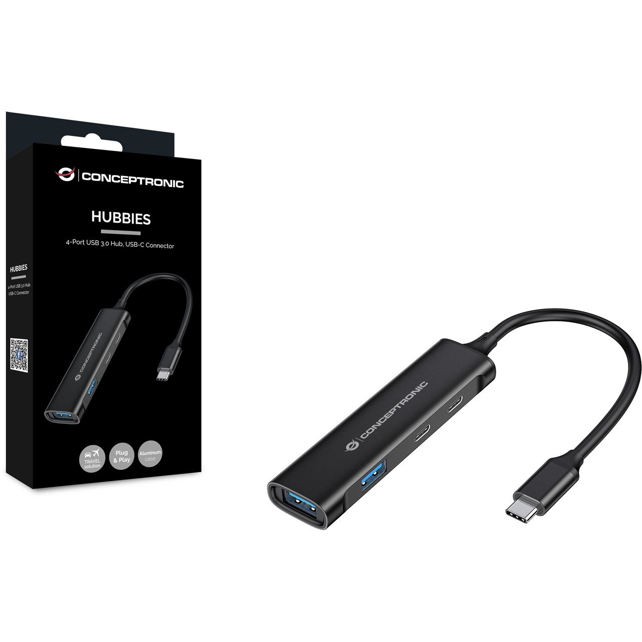 Conceptronic HUBBIES 4-Port-USB 3.0-Hub, USB-C-Anschluss. Hostschnittstelle: USB 3.2 Gen 1 (3.1 Gen 1) Type-C. Datenübertragungsrate: 5000 Mbit/s, Produktfarbe: Schwarz, Gehäusematerial: Aluminium. Netzteiltyp: USB. Unterstützt Windows-Betriebssysteme: Windows 10, Windows 10 Education, Windows 10 Education x64, Windows 10 Enterprise, Windows 10..., Unterstützt Mac-Betriebssysteme: Mac OS X 10.10 Yosemite, Mac OS X 10.11 El Capitan, Mac OS X 10.12 Sierra, Mac OS X 10.13 High.... Breite: 24 mm, Tiefe: 92 mm, Höhe: 12 mm