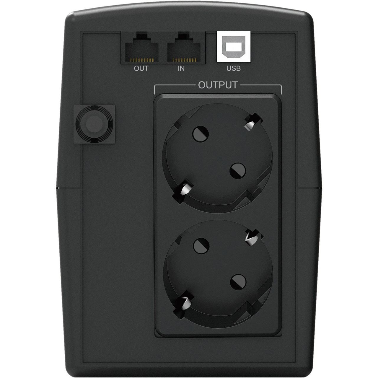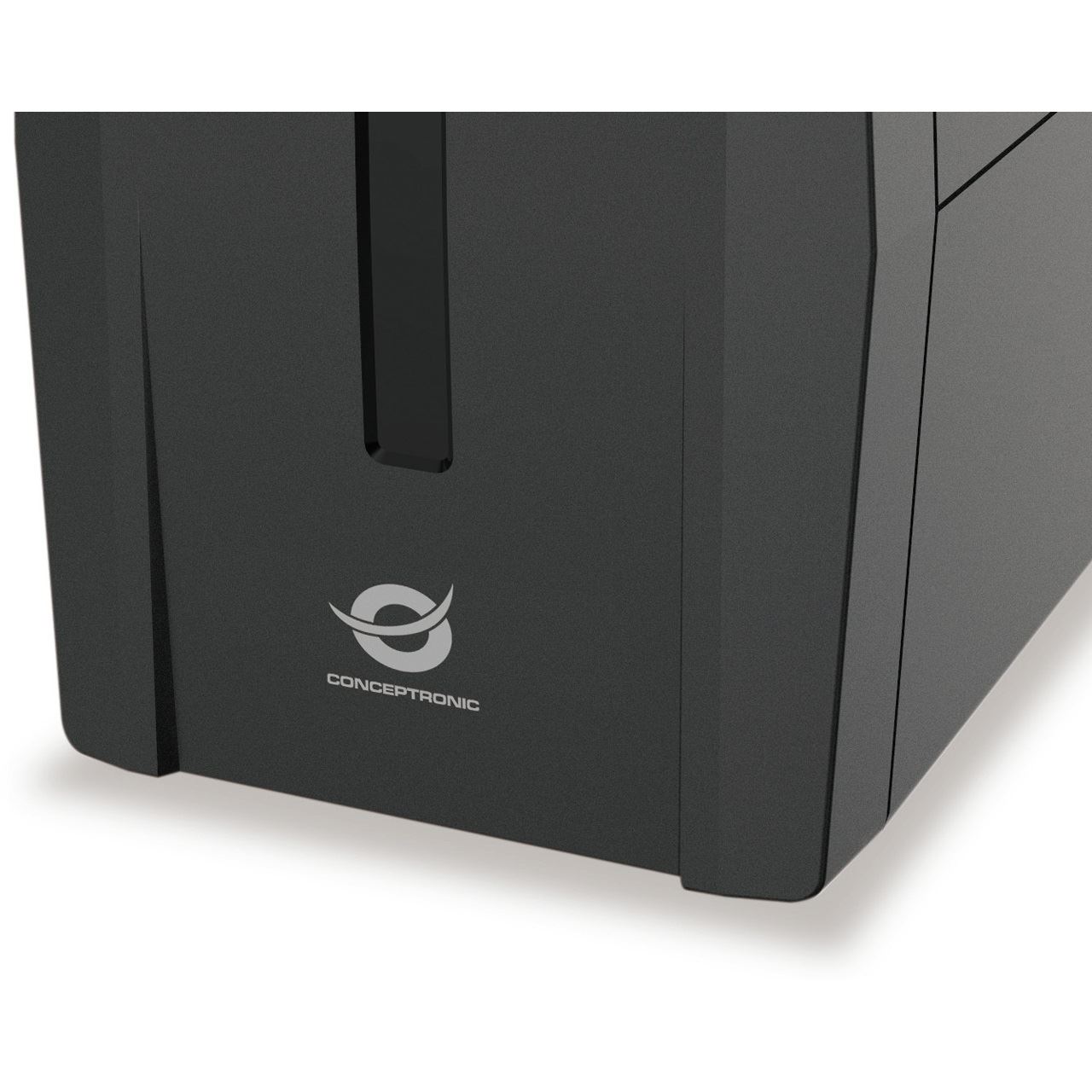 Conceptronic 850VA 480W USV, Schutzkontakt. USV-Topologie: Line-Interaktiv, Ausgangskapazität: 0,85 kVA, Ausgangsleistung: 480 W. AC-Steckertypen: Typ F, Anzahl der AC-Ausgänge: 2 AC-Ausgänge, USB-Port-Typ: USB Typ-B. Batteriekapazität: 7,5 Ah, Akku-/Batteriespannung: 12 V, Akku-Ladezeit (90 %): 8 h. Formfaktor: Mini Tower, Produktfarbe: Schwarz. Breite: 96 mm, Tiefe: 286 mm, Höhe: 138 mm