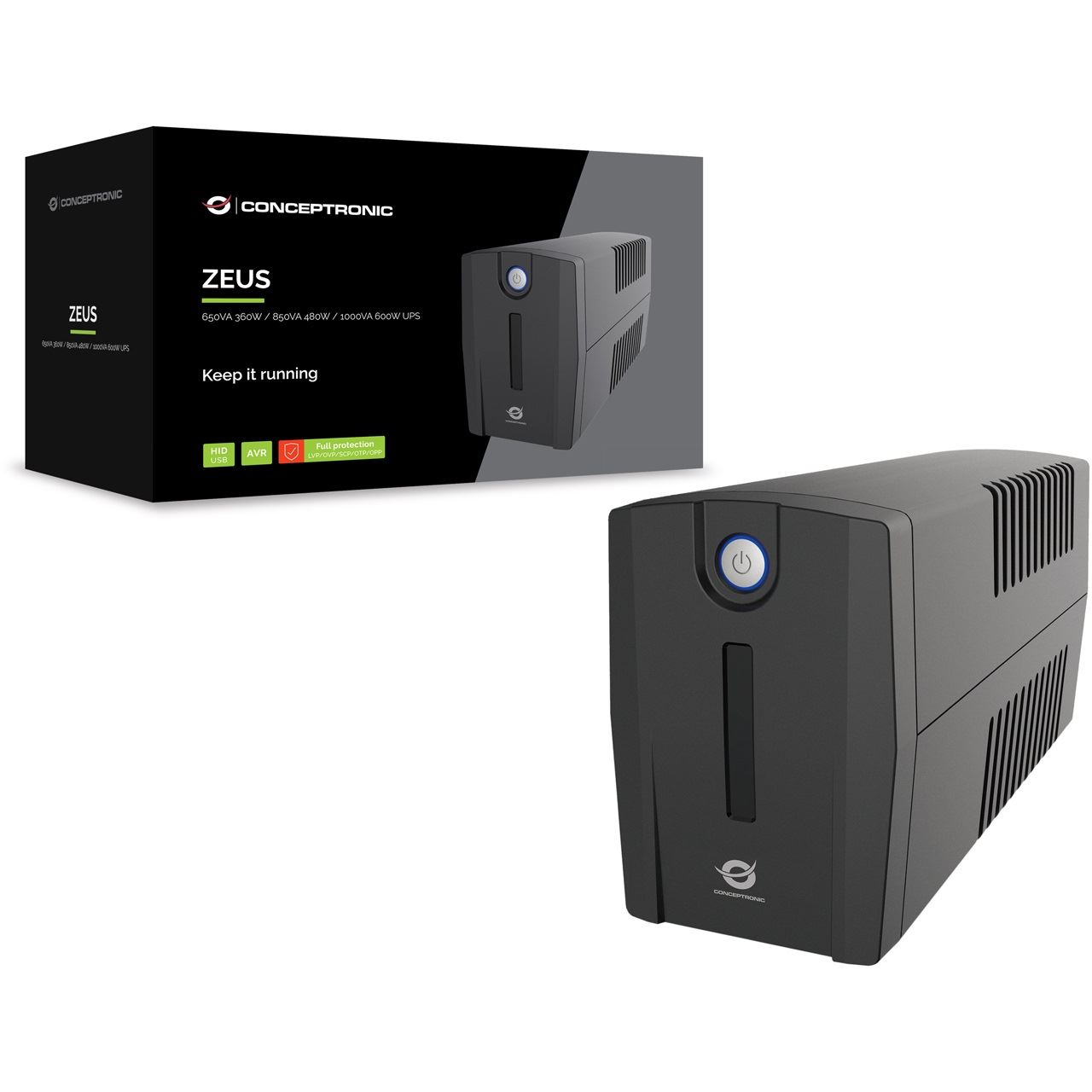 Conceptronic ZEUS02G 850VA 480W USV, 2x UK-Steckdosen, HID-USB, RJ45 Ein/Aus, mit AVR-Funktion. USV-Topologie: Line-Interaktiv, Ausgangskapazität: 0,85 kVA, Ausgangsleistung: 480 W. AC-Steckertypen: Typ G (BS 1363), Anzahl der AC-Ausgänge: 2 AC-Ausgänge, USB-Port-Typ: USB Typ-B. Akku-/Batterietechnologie: Bleisäure, Batteriekapazität: 7,5 Ah, Akku-/Batteriespannung: 12 V. Formfaktor: Desktop, Produktfarbe: Schwarz, Internationale Schutzart (IP-Code): IP20. Konformitätsbescheinigungen: CE, RoHS
