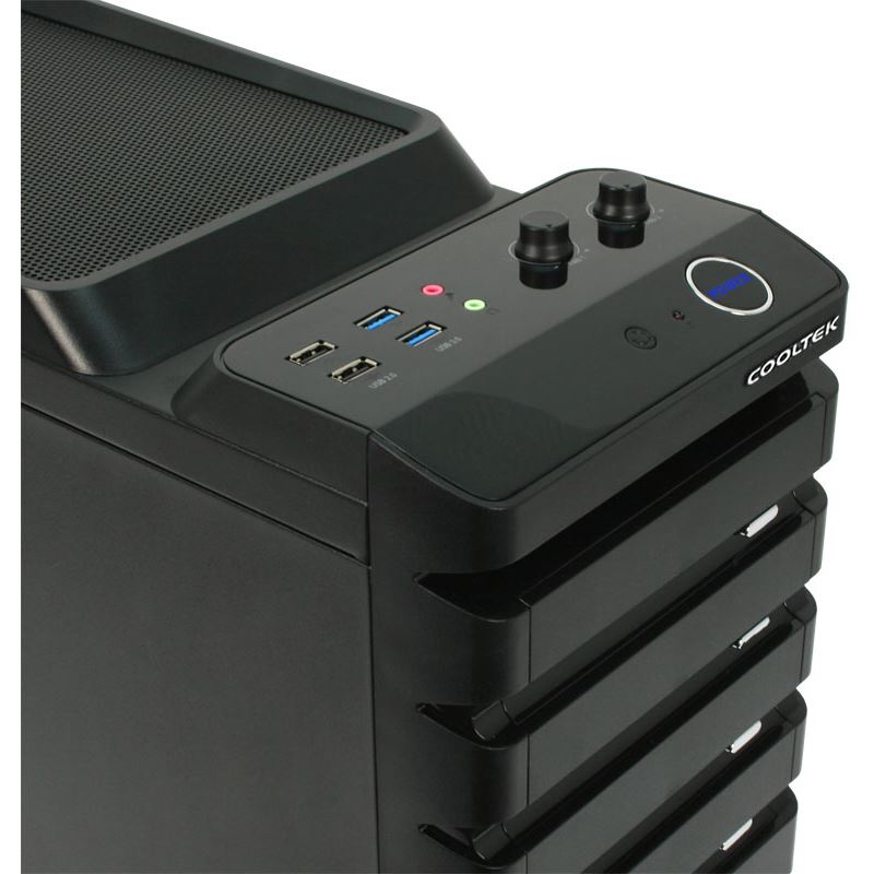 Das Cooltek K5 verfügt serienmäßig über eine 2-Kanal Lüftersteuerung für bis zu vier Lüfter im oberen Frontbereich. Mit dem innovativen „advanced modular ventilation concept“ (fortgeschrittenes, modulares Belüftungskonzept) bietet das System die Möglichkeit, die Belüftung Ihres PC-Systems individuell nach Ihren Wünschen zu konfigurieren und zwischen verschiedenen Lüfterkombinationen zu wählen.