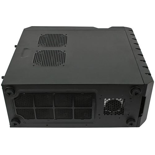 Hinter der eleganten Front rotiert ein blau beleuchteter 140 mm LED Lüfter, der dank der MESH-Elemente im unteren Frontbereich besonders gut zur Geltung kommt. Im oberen Bereich der Front stehen dem Anwender vier extern zugängliche 5,25" Laufwerksschächte zur Verfügung. Alle vier 5,25" Schächte sind mit Flip-Down-Blenden ausgestattet. Dadurch wird selbst bei Verwendung eines andersfarbigen optischen Laufwerks ein farblich einheitliches Erscheinungsbild beibehalten. Es können alle herkömmlichen Laufwerke mit Tray-Schublade verwendet werden. Die Montage der 5,25" Laufwerke erfolgt über praktische Quick-Lock Verschlüsse ganz ohne den Einsatz von Schrauben und Werkzeug.
