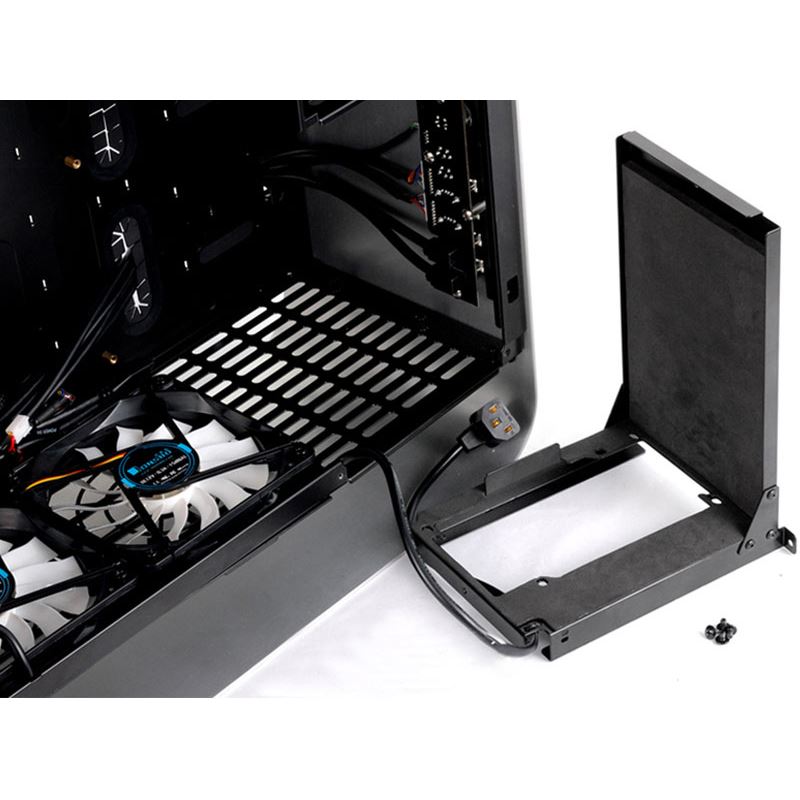 Wie auch das Exterieur überzeugt auch das Innenleben des Gehäuses durch sein innovatives Design. Das Netzteil wird platzsparend in einem speziell entworfenen Rahmen hinter der Gehäusefront installiert. Der Stromanschluss findet sich wie gewohnt an der Gehäuserückseite, ein entsprechendes Kabel zum Durchschleifen des Stroms ist vorinstalliert.
