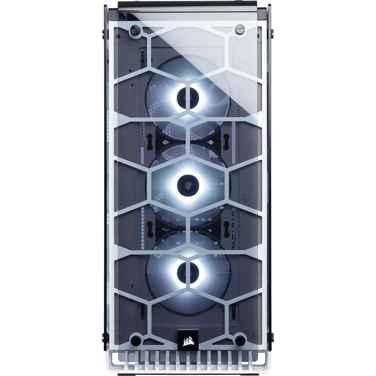 Das gesamte Gehäuse besteht aus perfekt gehärtetem Glas und gewährt freien Blick auf jede Komponente Ihres Systems einschließlich drei SP120 RGB-LED-Lüftern und einem integrierten LED-Controller.