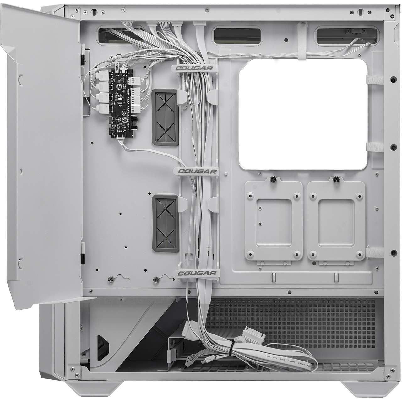Das erstklassige Kabelmanagement verfügt über Kabelführungsschienen und sieben Klettverschlüsse zum Sichern widerspenstiger Kabel. Eine diskrete Abdeckung sorgt dafür, dass alles außer Sichtweite bleibt, und bietet einen ungetrübten Blick auf den Innenraum.