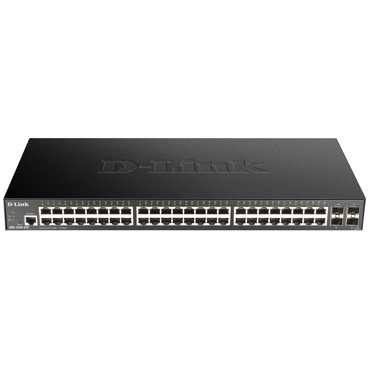 D-Link DGS-1250-52X. Switch-Typ: Managed, Switch-Ebene: L3. Basic Switching RJ-45 Ethernet Ports-Typ: Gigabit Ethernet (10/100/1000), Anzahl der basisschaltenden RJ-45 Ethernet Ports: 48, Konsolen-Port: RJ-45. MAC-Adressentabelle: 32000 Eintragungen, Routing-/Switching-Kapazität: 176 Gbit/s. Netzstandard: IEEE 802.1D, IEEE 802.1Q, IEEE 802.1p, IEEE 802.1s, IEEE 802.1w, IEEE 802.3, IEEE 802.3ab, IEEE.... Rack-Einbau