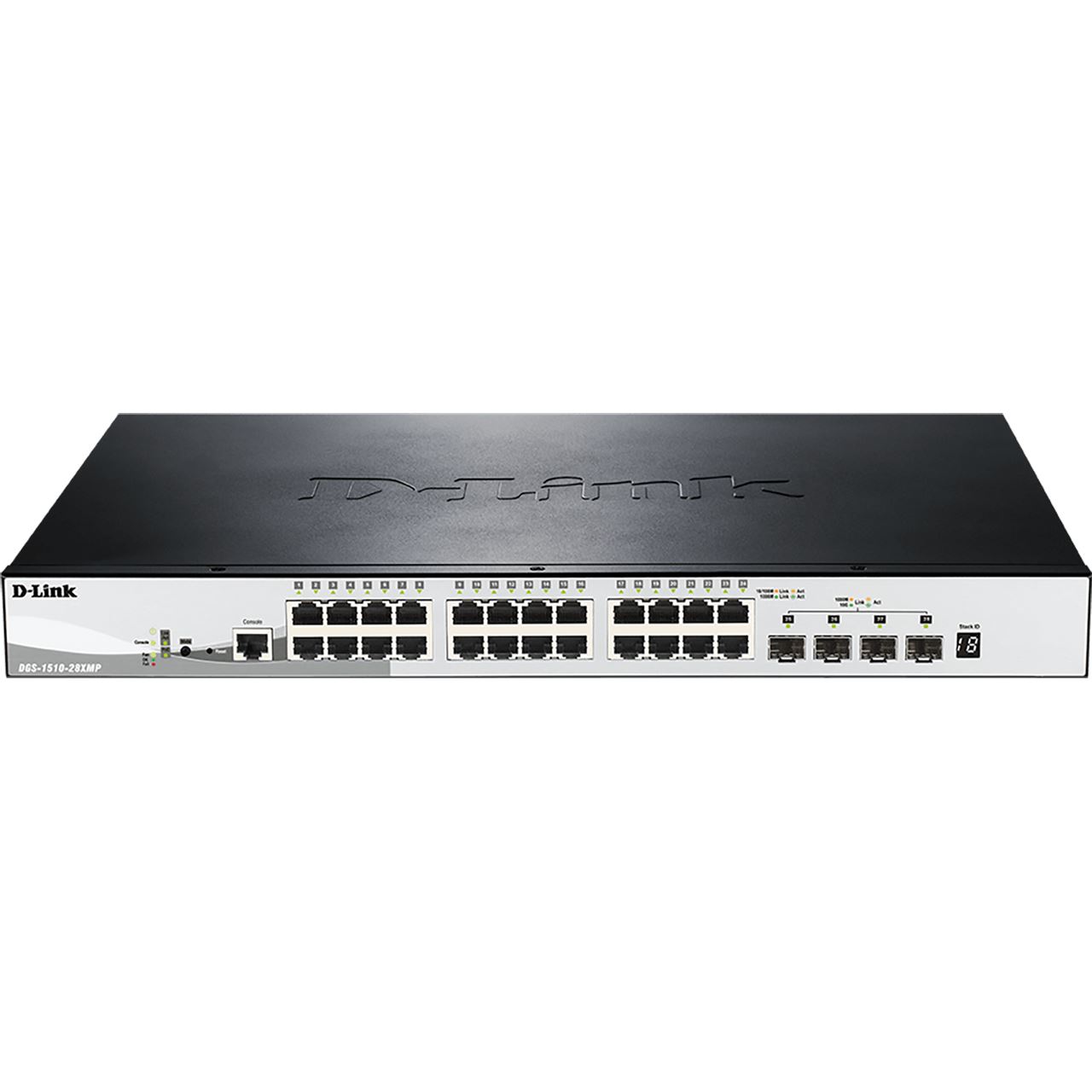 D-Link DGS-1510-28XMP. Switch-Typ: Managed, Switch-Ebene: L2/L3. Basic Switching RJ-45 Ethernet Ports-Typ: Gigabit Ethernet (10/100/1000), Anzahl der basisschaltenden RJ-45 Ethernet Ports: 24. Vollduplex. MAC-Adressentabelle: 16384 Eintragungen, Routing-/Switching-Kapazität: 128 Gbit/s. Netzstandard: IEEE 802.1D, IEEE 802.1Q, IEEE 802.1p, IEEE 802.1s, IEEE 802.1w, IEEE 802.1x, IEEE 802.3, IEEE.... Power over Ethernet (PoE). Rack-Einbau