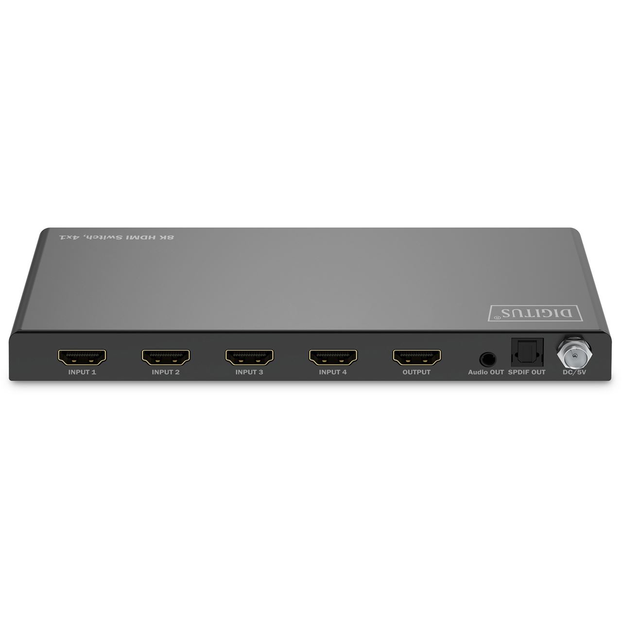 Der DIGITUS® 8K HDMI Switch, 4x1 bietet zusätzliche HDMI-Anschlüsse für Ihr Ausgabedisplay - 4 Signalquellen lassen über nur 1 HDMI Anschluss am Bildschrim anbinden. Ebenso können Audio-Signale über Toslink oder 3,5 mm Stereo Anschluss ausgekoppelt und separat wiedergegeben werden. Wechseln Sie bequem zwischen den Signalquellen via Fernbedienung, am Gerät selbst oder via automatischer Erkennung.