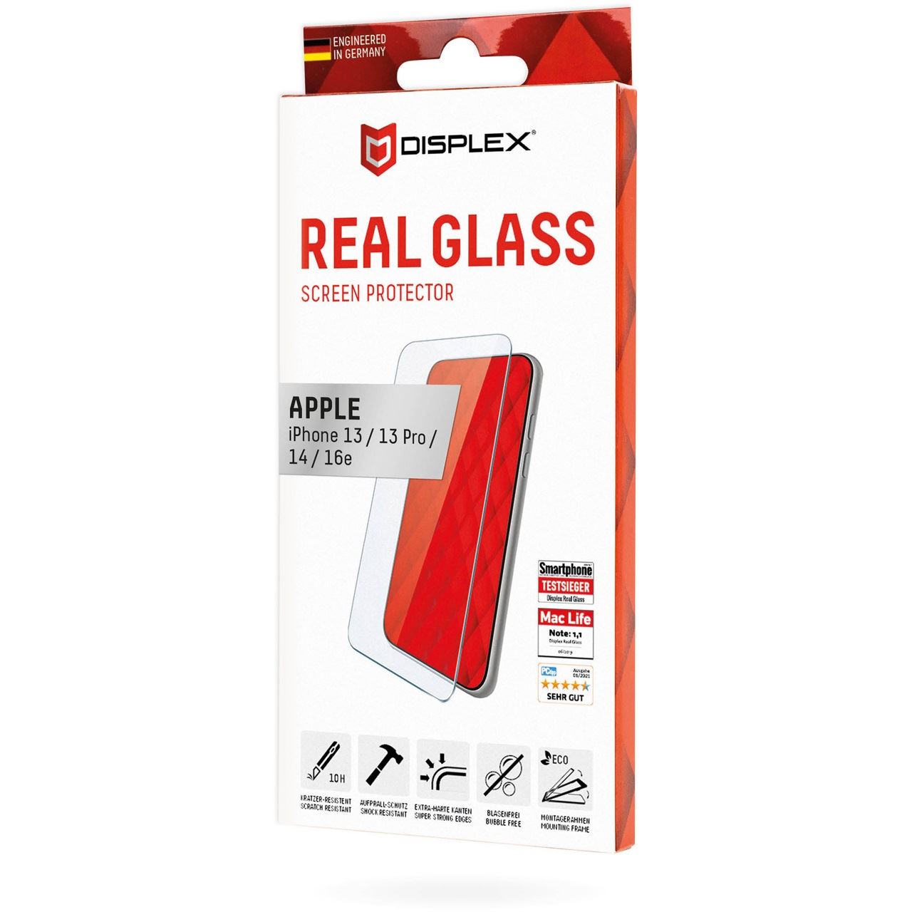 Displex Panzerglas (10H, 2D) für Apple iPhone iPhone 13/13 Pro/14/16e/17e, Eco-Montagerahmen, kratzer-resistent. Markenkompatibilität: Apple, Kompatibilität: iPhone 13/13 Pro/14/16e/17e. Trockene Anwendung. Schutzfunktion: Schlagfest, Kratzresistent, Staubresistent. Oberflächenlackierung: Glänzend, Material: Gehärtetes Glas, Produktfarbe: Transparent. Menge pro Packung: 1 Stück(e)