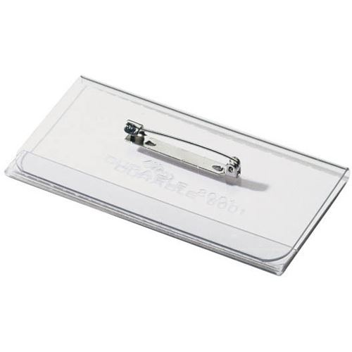 aus transparentem Kunststoff, verdeckte Nadelspitze, Daumenausstanzung auf der Rückseite, inkl. 1 blanko Einsteckschild je Namensschild Inhalt: 100 Stück (8001-19)