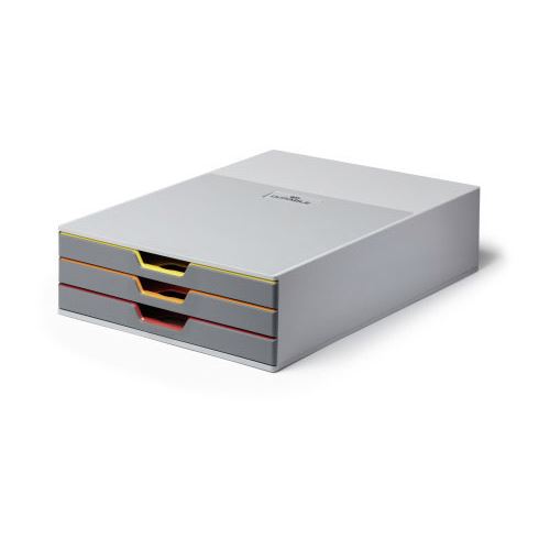 Der Klassiker im Büro, um Unterlagen übersichtlich und griffbereit aufzubewahren: Schubladenboxen im modernen VARICOLOR Design. Geschlossen geben dezente Farblinien auf edlem Grau Orientierung, geöffnet begeistern die leichtlaufenden Schubladen mit fröhlicher Farbgebung.