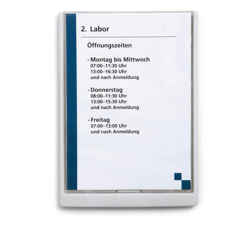 Türschild aus Kunststoff mit farbigem Rahmen Leichter Austausch der Kartoneinlagen durch Aufklappen des Sichtfensters Zum Anschrauben oder Ankleben, inkl. Montageset, Bohrschablone und Anleitung Passende Einsteckschilder (Art. 4856) separat erhältlich zur professionellen Beschriftung mit DURAPRINT® Maße: 210 x 297 mm (B x H)