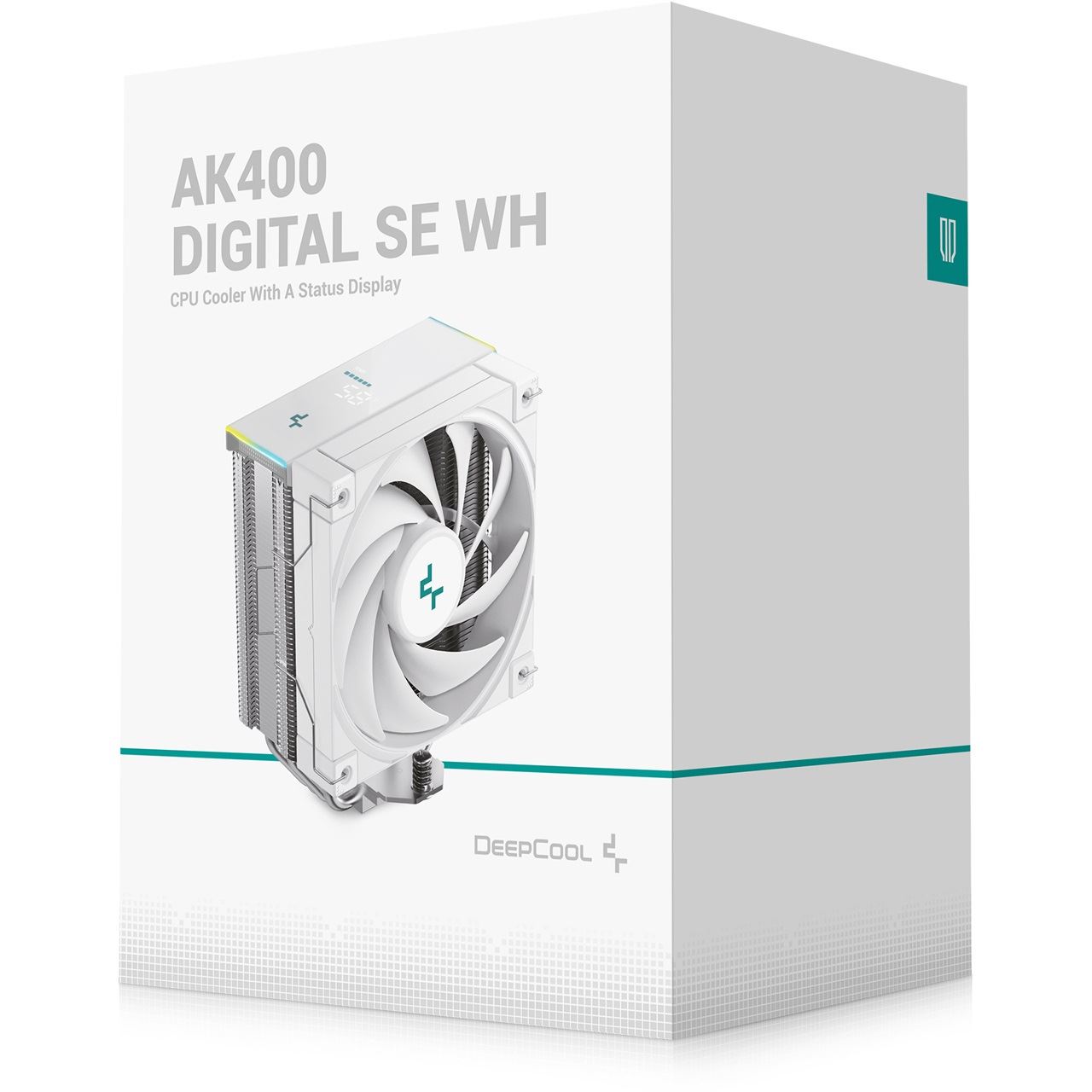 DeepCool AK400 Digital SE WH. Typ: Luftkühlung, Lüfterdurchmesser: 12 cm, Maximum Luftdruck: 2,19 mmH2O. Breite: 97 mm, Tiefe: 126 mm, Höhe: 157 mm. Produktfarbe: Weiß