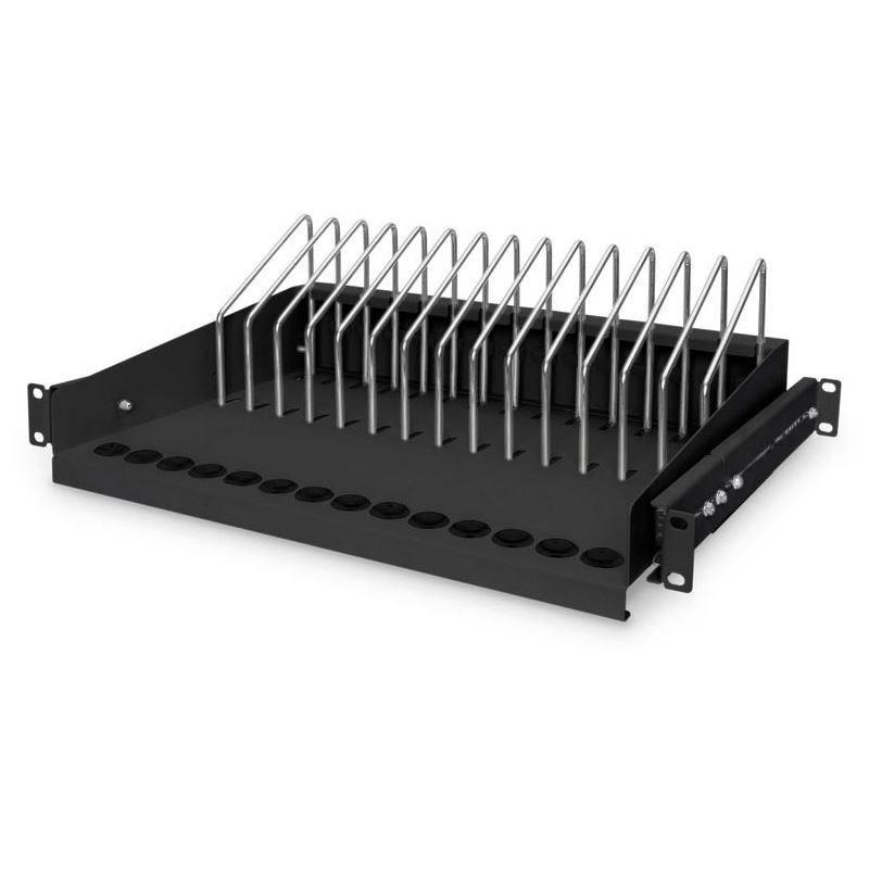 Mit diesem speziellen Fachboden können Sie jeden handelsüblichen 482,6 mm (19")-Schrank zur Aufbewahrung Ihrer portablen Geräte wie Tablet-PCs, Notebooks oder Smartphones nutzen. Die robusten Stahlbügel bieten Platz für bis zu 14 Geräte. An der Vorderseite befinden sich Kabeldurchlässe, sodass die Geräte optimal verkabelt werden können, um sie beispielsweise an eine Stromquelle zum Laden anzuschließen. Die Unterseite ist mit einer Ablage für Kabelüberlängen ausgestattet. Zur nutzerfreundlichen Bedienung lässt sich der Fachboden im montierten Zustand nach vorne herausziehen, um schnell und einfach an die angeschlossenen Komponenten zu gelangen. Auf der 482,6 mm (19") Ebene wird lediglich eine Höheneinheit (1HE) benötigt, um den Fachboden zu befestigen. Die komplette Höhe inkl. der Metallbügel beträgt 175 mm.