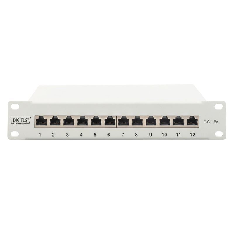 Digitus CAT 6A Patch Panel, geschirmt, 12-Port, 1HE, 10", grau. Ethernet Schnittstellen Typ: 10 Gigabit Ethernet, Stecker: RJ-45, unterstütze Kabeltypen: Cat6a. Produktfarbe: Grau, Material: Metall, Montage: Rackeinbau. Verpackungsbreite: 60 mm, Verpackungstiefe: 260 mm, Paketgewicht: 890 g. Ursprungsland: China