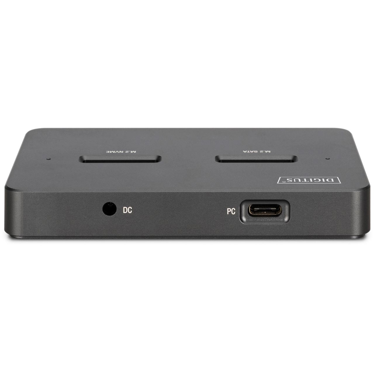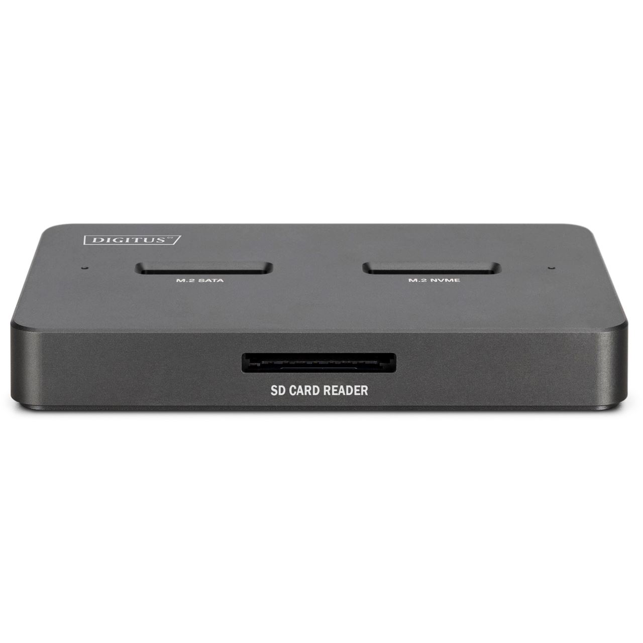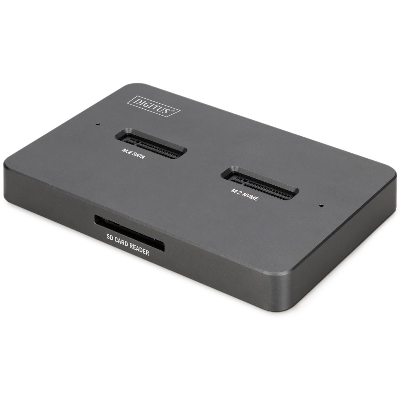 Digitus M.2 NVMe + M.2 SATA SSD Docking Station mit SD-Express Kartenleser, USB-C™. Speichermedien Typ: SSD, Speicherlaufwerk Schnittstelle: M.2, unterstützte Speicherlaufwerksgrößen: M.2. Hostschnittstelle: USB 3.2 Gen 2 (3.1 Gen 2) Type-C. Produktfarbe: Schwarz, Max. Datenübertragungsrate: 10 Gbit/s, Kompatible Speicherkarten: SD. AC Eingangsspannung: 100 - 240 V, AC Eingangsfrequenz: 50/60 Hz. Breite: 102 mm, Tiefe: 66 mm, Höhe: 15 mm