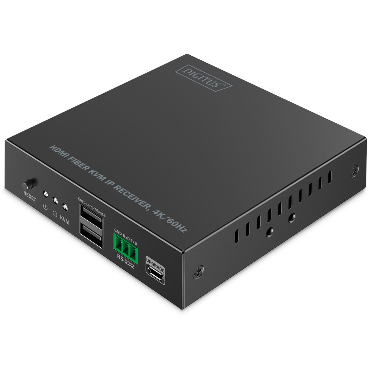 Digitus HDMI Fiber KVM IP Receiver, 4K/60Hz. Typ: Receiver, Übertragungstechnik: Kabelgebunden, Maximal mögliche Übertragungsstrecke: 40000 m. Empfänger lokaler Video-Anschlusstyp: HDMI, Empfänger lokale Tastatur/Maus-Anschlusstyp: USB. USB-Port-Typ: USB Type-A/Micro-USB. Netzteil Ausgangsspannung: 5 V, AC-Adapter Ausgangssstrom: 2 A, Stromverbrauch (Empfänger) (max.): 7,5 W. Breite des Receivers: 10,3 cm, Tiefe des Receivers: 10,6 cm, Höhe des Receivers: 2,6 cm