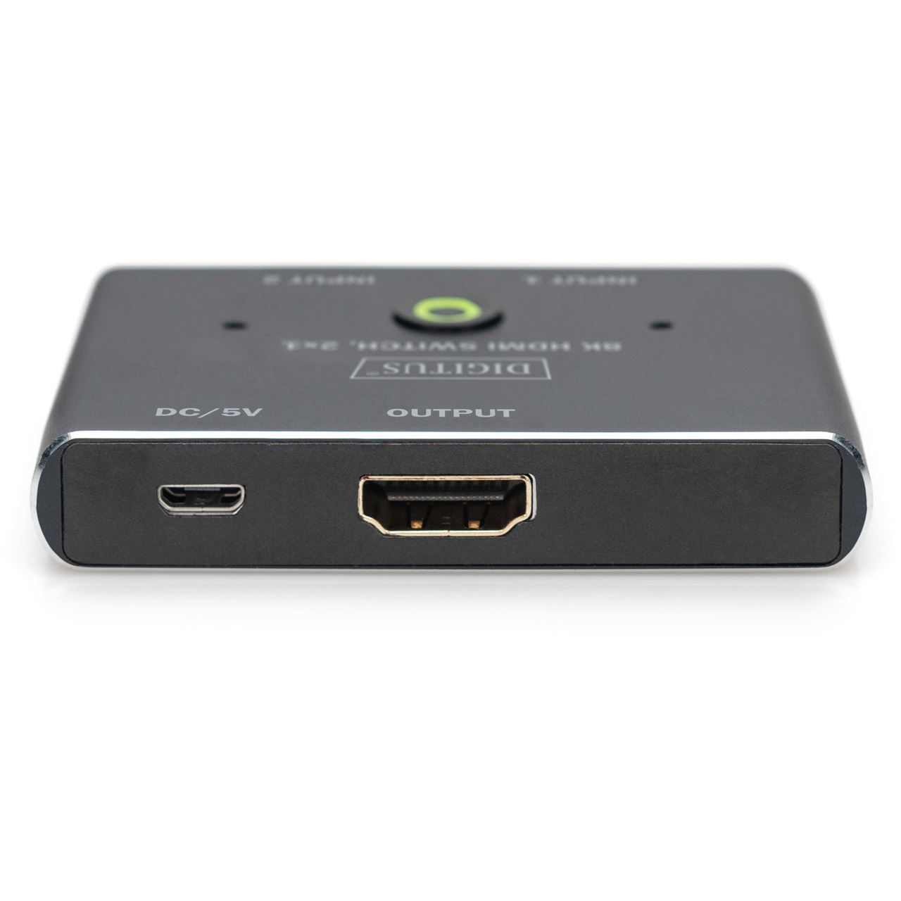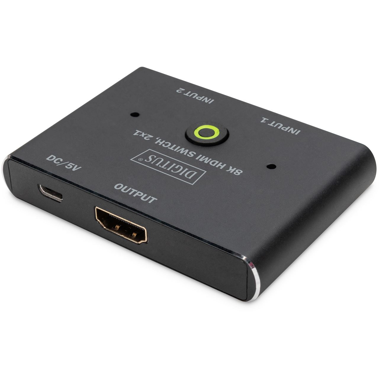Digitus 8K HDMI Switch, 2x1. Video Porttyp: HDMI, HDMI-Version: 2.0/2.1, USB-Port-Typ: Mikro-USB. Material: Aluminium, Produktfarbe: Schwarz, Maximale Bildwiederholrate: 60 Hz. Breite: 57 mm, Tiefe: 70 mm, Höhe: 13 mm. Verpackungsbreite: 20 mm, Verpackungstiefe: 133 mm, Paketgewicht: 108 g. Menge pro Packung: 1 Stück(e), Mitgelieferte Kabel: USB