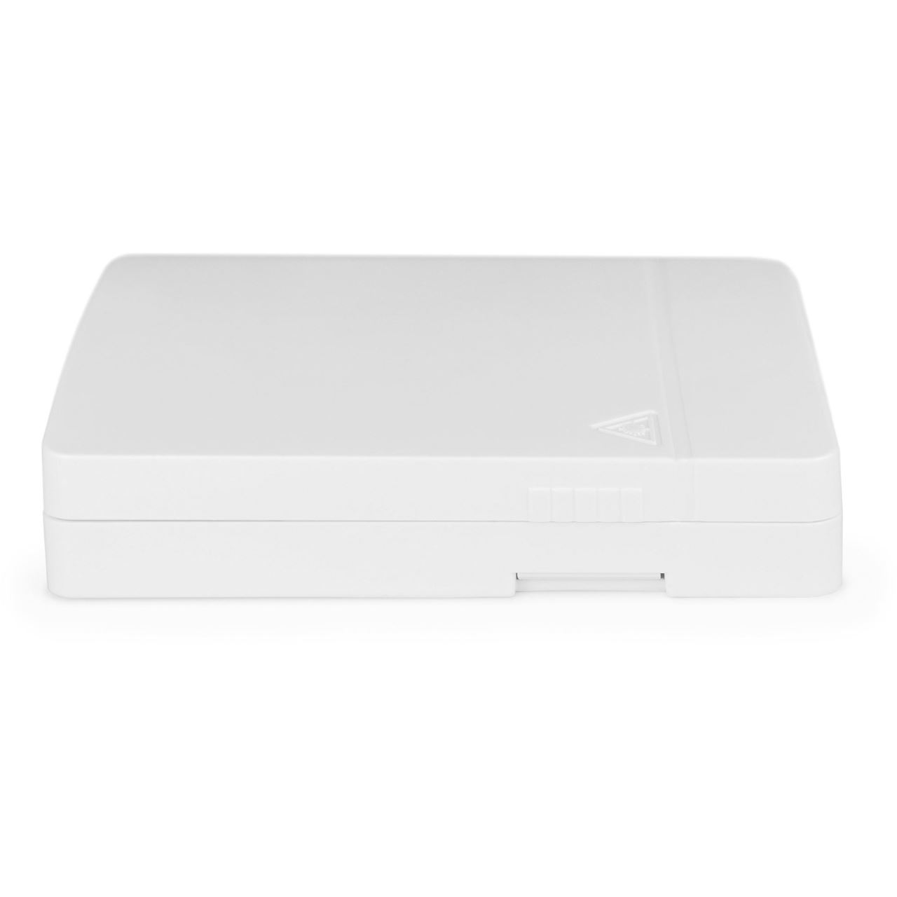 FTTH Gehäuse im minimalen Design für die Verteilung von bis zu 4 Fasern. Das kompakte Schutzgehäuse eignet sich perfekt für die FTTH- und Büroverkabelung für Glasfaserspleißungen, Abschlüsse und Verbindungen.