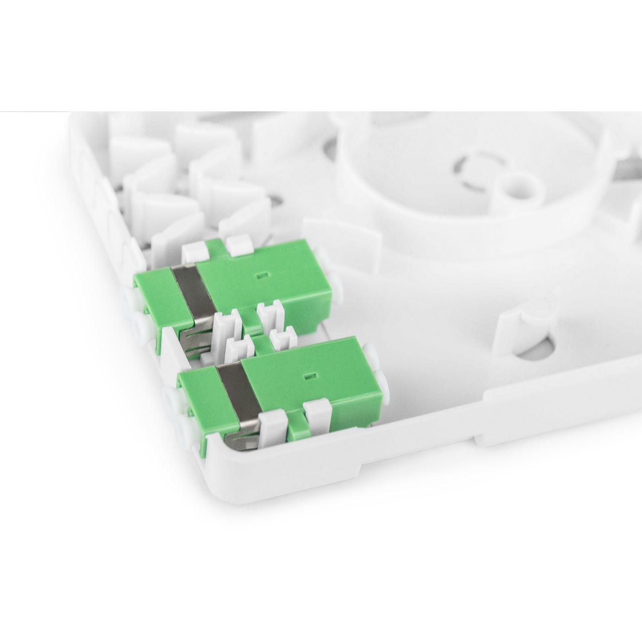 Digitus FTTH Gehäuse mit 2 x LC/APC DX Kupplungen. Befestigungstyp: Wand, Produktfarbe: Weiß, Gehäusematerial: ABS Synthetik, Polycarbonat (PC). Breite: 80 mm, Tiefe: 104 mm, Höhe: 23 mm