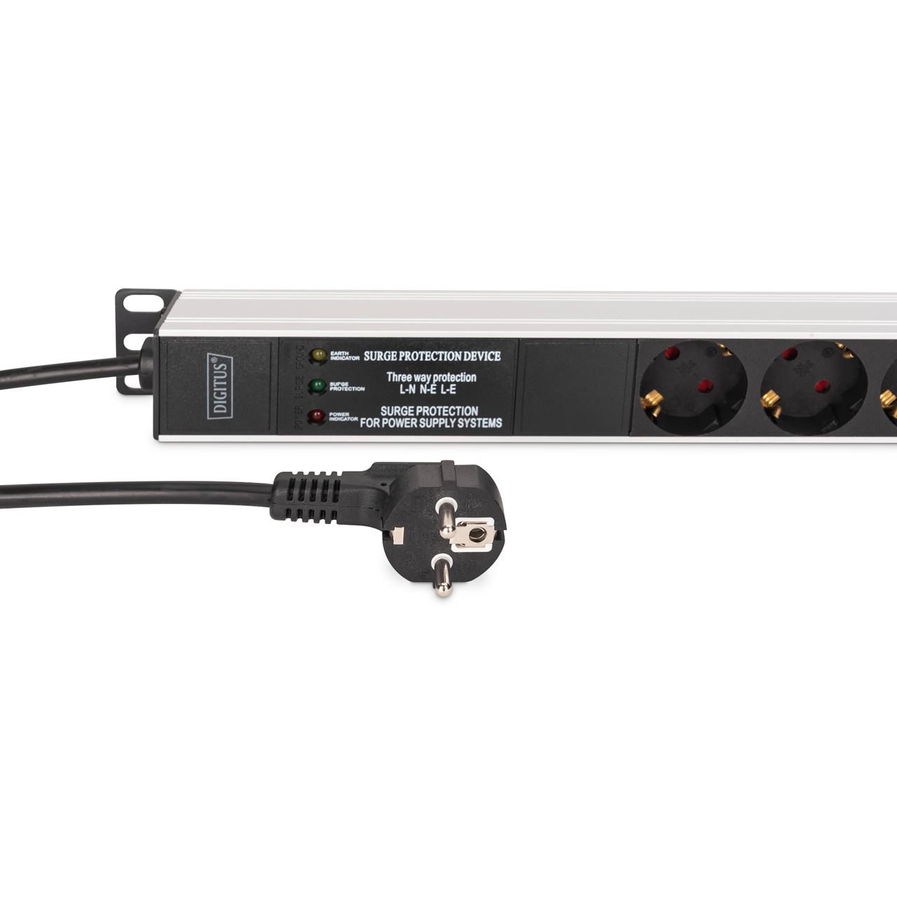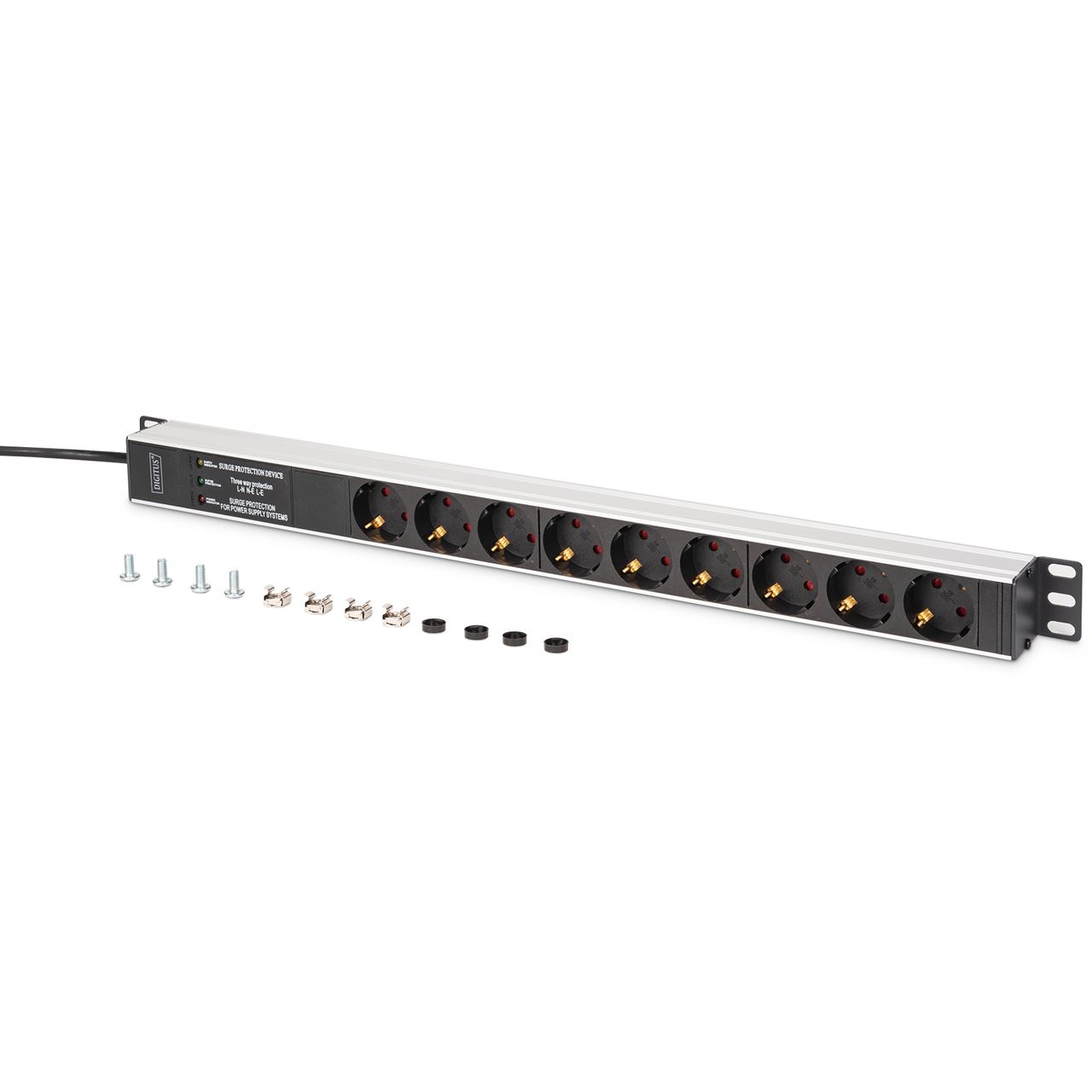 Digitus DN-95438. Rack-Kapazität: 1U, Montage: Horizontal/Vertikal, Gehäusematerial: ABS Synthetik, Aluminium. Anzahl der AC-Ausgänge: 9 AC-Ausgänge, AC-Steckertypen: Typ F, Stecker: Typ F. Kabellänge: 2 m, Kabeltyp: H05VV-F 35. Nominale Eingang Spannung: 230 V, Stromstärke (maximal): 16 A, AC Eingangsfrequenz: 50/60 Hz. Breite: 45 mm, Tiefe: 45 mm, Höhe: 620 mm