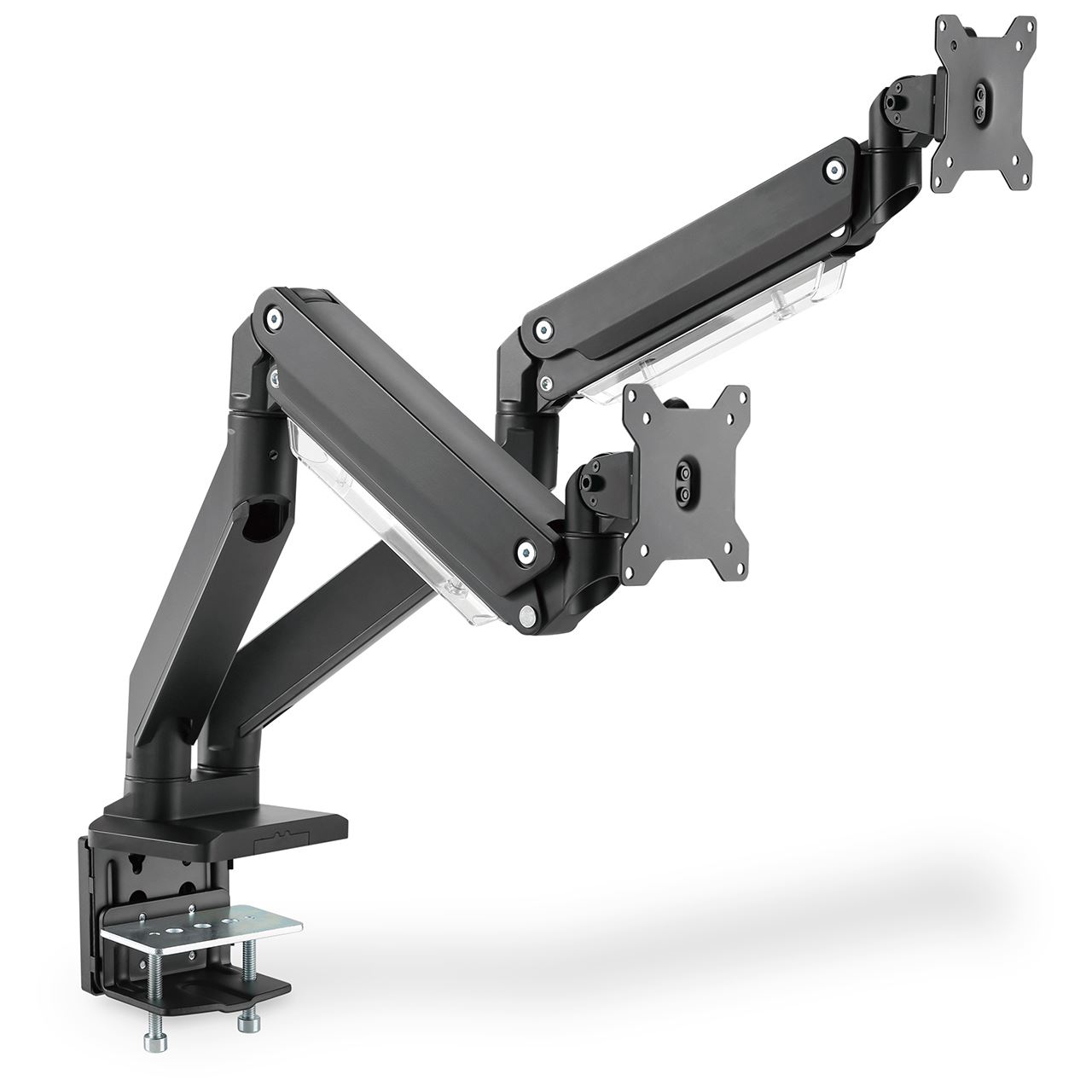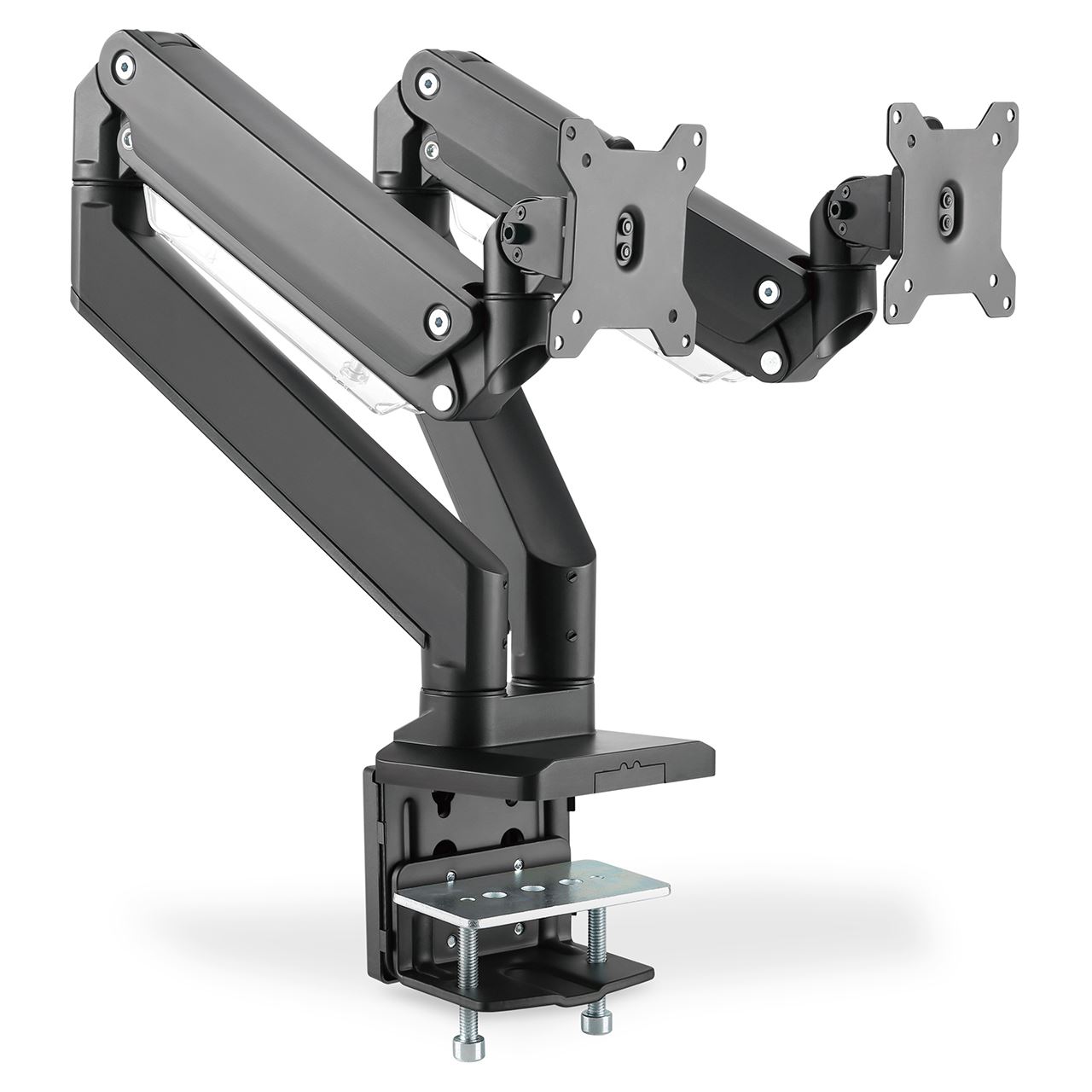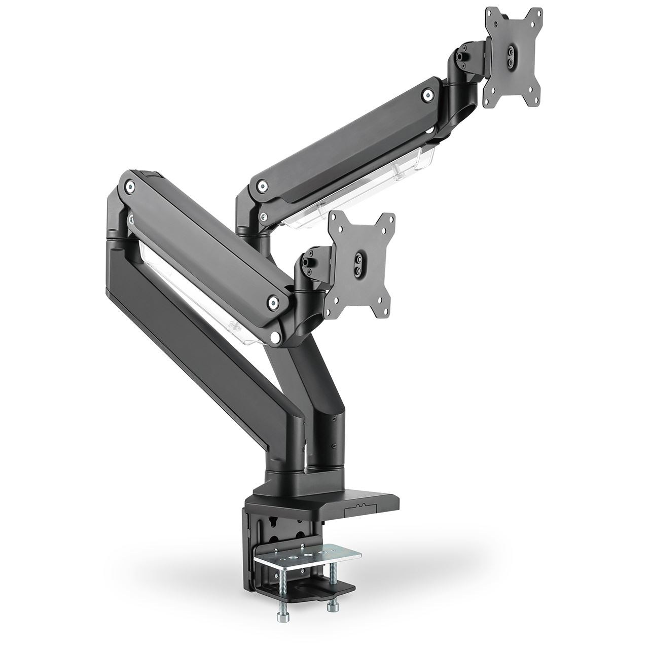 Mit der universellen Monitorhalterung von DIGITUS® können Sie einen Monitor der Größen 15" - 35" bequem per Klemmbefestigung am Schreibtisch befestigen. Die Quick-Release-Funktion erleichtert Ihnen zudem die Installation des Monitors. Die VESA-Halterung wird ganz einfach in die entsprechende Aufnahme geschoben und rastet automatisch ein. Ohne großen Aufwand richten Sie den Monitor nach Ihren Bedürfnissen aus und können diesen schwenken, neigen oder den Monitor selbst drehen z. B. für Hochformat-Monitore. Die Unterstützung der integrierten Gasdruckfeder erleichtert Ihnen die Höhenverstellung des Monitors. Zusätzlich lassen sich die Kabel der Monitore ordentlich durch die mitgelieferten Kabelführungen verlegen. Tun Sie sich und Ihrer Gesundheit etwas Gutes, indem Sie den Monitor optimal an Ihren Körper und Ihre Sitzposition anpassen.