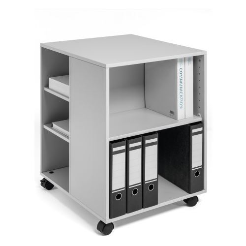 Multifunktions-Fahrwagen 3-seitig offen mit 4 Böden und einer Ablageplatte für die Unterbringung von Ordnern etc. Belastbarkeit des oberen Bodens ca. 25 kg. Hochwertig aus 16 mm starkem, melaminbeschichtetem Holz, das Schutz gegen Kratzer bietet. Voll mobil mit 4 Rollen, 2 davon mit Bremse. Maße: 748 x 528 x 592 mm (H x B x T). Lieferung erfolgt demontiert mit Montageanleitung.