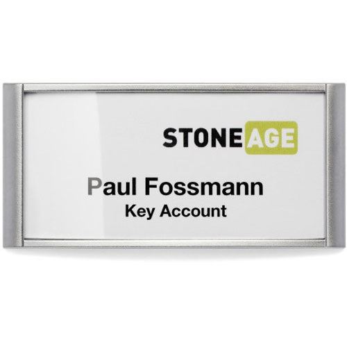 Die galvanisierten Namensschilder in Aluminium-Optik sind ideal für den Dauereinsatz auf Messen, im Hotel oder im Ladengeschäft. Die besonders langlebigen Namensschilder mit elegantem, silbernen Rahmen können bei Bedarf schnell neu beschriftet werden. Dank der dezenten Lasche auf der Rückseite kann das Einsteckschild kinderleicht ausgewechselt werden.