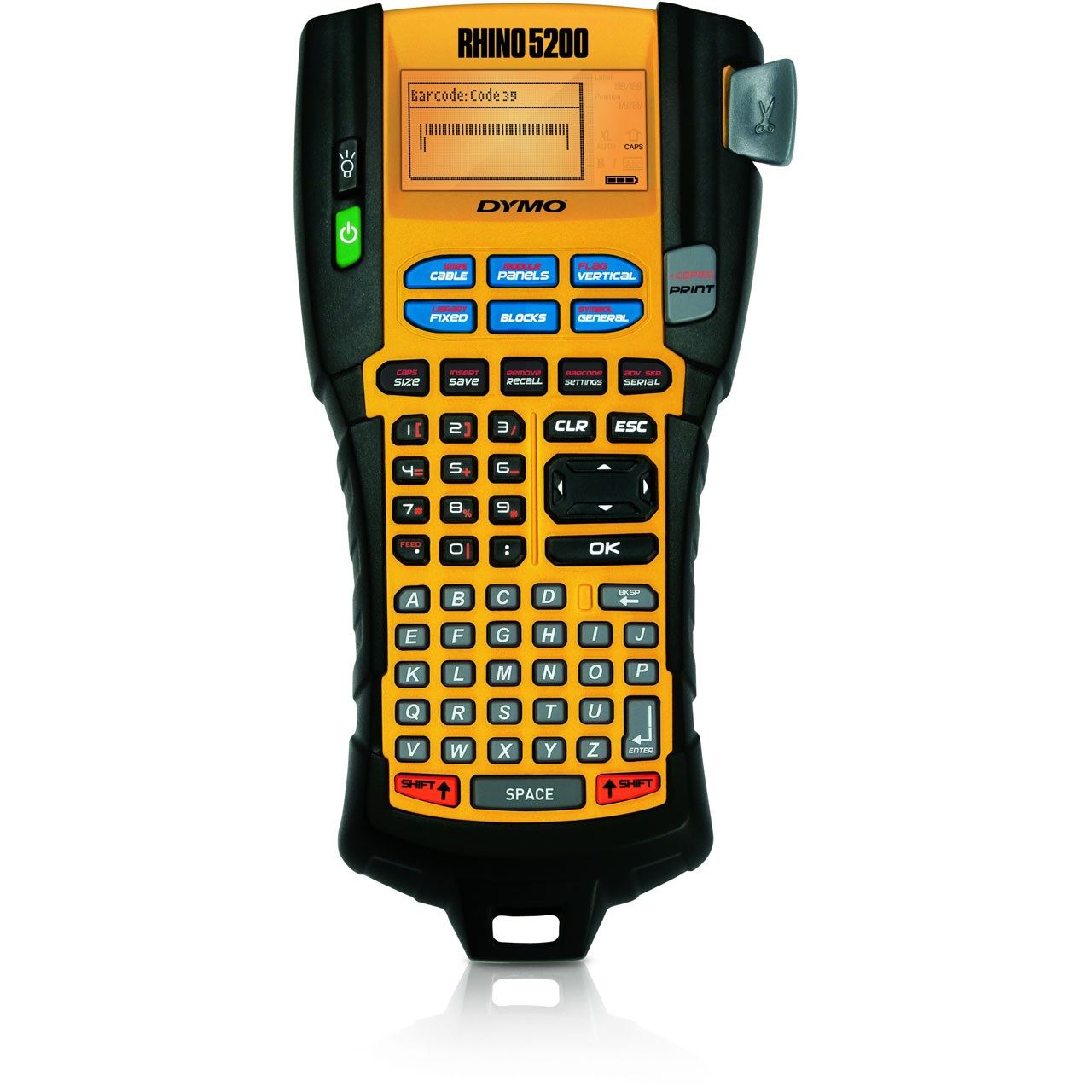 DYMO RHINO 5200. Tastaturaufbau: ABC. Drucktechnologie: Wärmeübertragung, Maximale Auflösung: 180 x 180 DPI, Druckgeschwindigkeit (metrisch): 10 mm/sek. Unterstützte Papierbreite: 6, 9, 12, 19 mm. Produktfarbe: Schwarz, Gelb