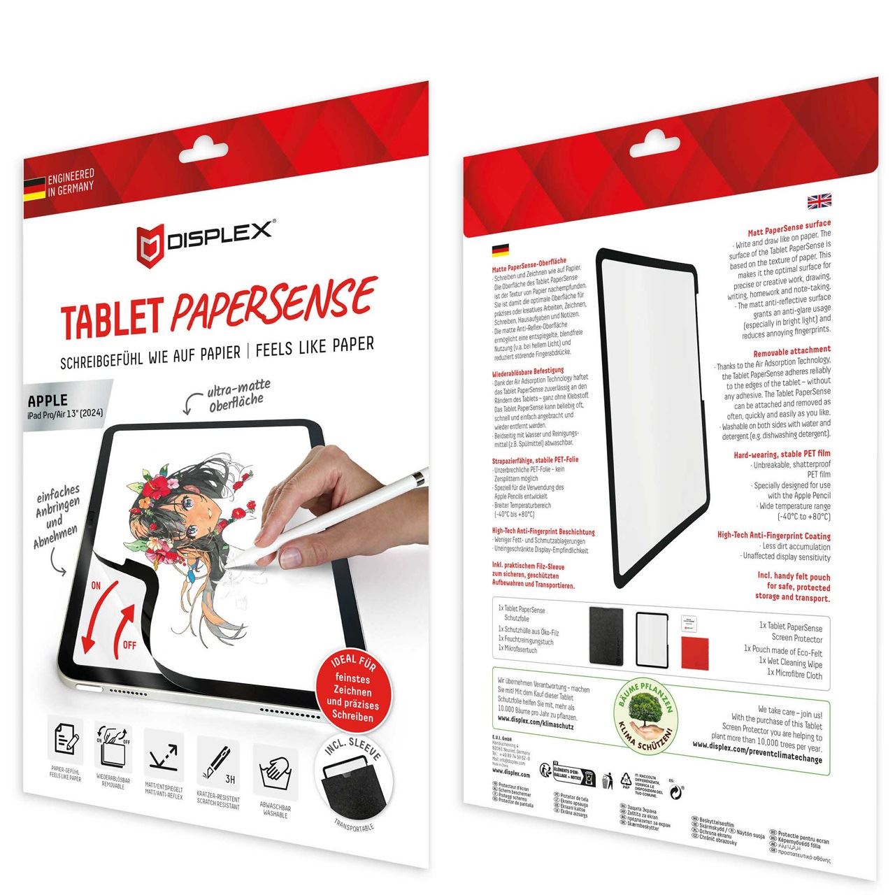 Displex TABLET PAPERSENSE für iPad Pro 13'' (2024)/Air 13'' (2025/2024), wiederablösbare Schreibfolie und Zeichenfolie mit Paper Feeling. Displayschutzart: Papierähnliche Schutzfolie für den Bildschirm, Maximale Bildschirmgröße: 33 cm (13"), Oberflächenlackierung: Matt, Material: Polyethylenterephthalat, Härte: 5H, Markenkompatibilität: Apple, Kompatibilität: iPad Pro 13'' (2024)/Air 13'' (2025/2024). Menge pro Packung: 1 Stück(e)