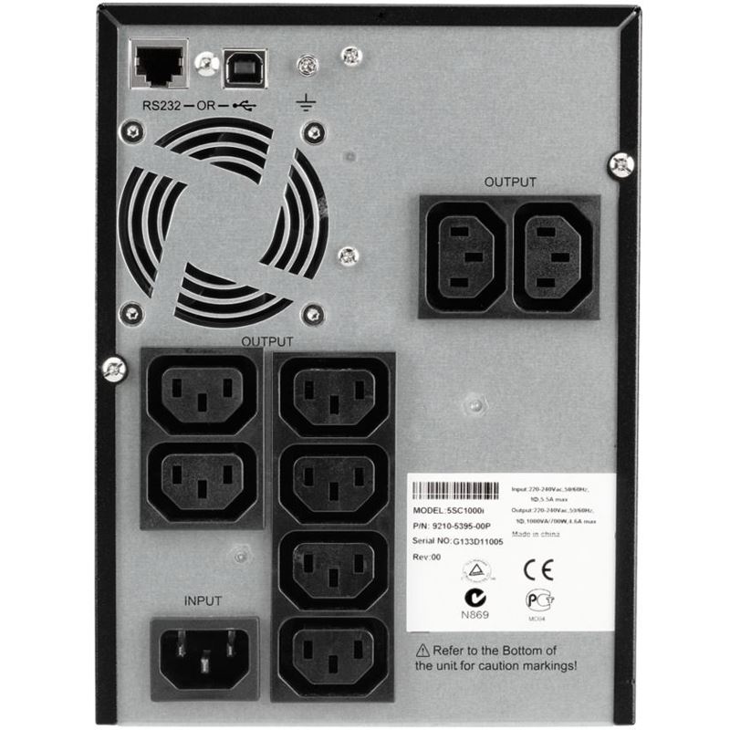 Eaton 5SC1000i. Ausgangskapazität: 1 kVA, Ausgangsleistung: 700 W, Wellenform: Sine. AC-Steckertypen: C13-Koppler, Stecker: C14-Koppler, Anzahl der AC-Ausgänge: 8 AC-Ausgänge. Typische Backup-Zeit bei voller Belastung: 5 min, Typische Backup-Zeit bei halber Belastung: 13 min. Formfaktor: Tower, Produktfarbe: Schwarz, Display-Typ: LCD. Breite: 150 mm, Tiefe: 340 mm, Höhe: 210 mm
