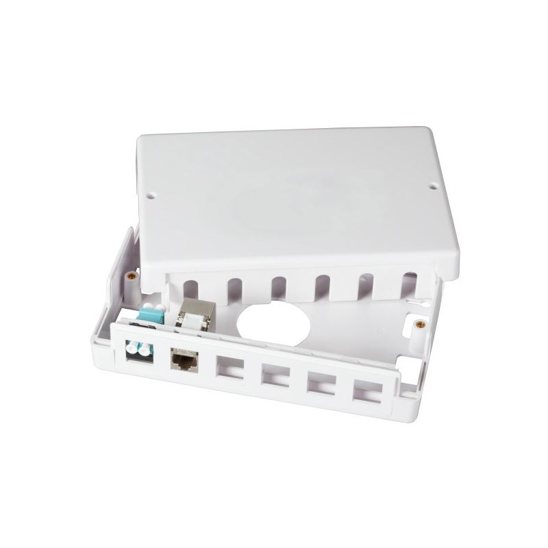 Das kompakte Kunststoffgehäuse dient zum Aufbau von Sammelpunkten an Schreibtischen, in Zwischendecken oder in Unterflursystemen. Das Leergehäuse eignet sich ebenso zur Wandmontage.