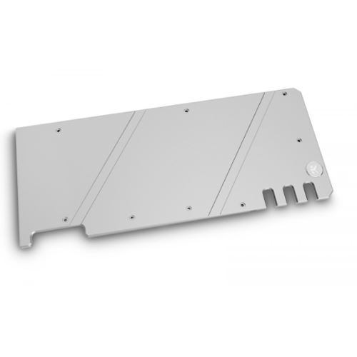 Ein dezentes und kleines EK-Logo ziert die silber vernickelte Aluminiumplatte. Die Backplate wird von zwei diagonalen und CNC-gefrästen Streifen geziert und ist abgesehen davon schnörkellos gehalten. Neben der optischen Aufwertung bietet die Backplate zudem eine höhere Stabilität. So wird effektiv verhindert, dass sich das PCB infolge einseitigen Anziehens der Schrauben bei der Befestigung des Hauptkühlers verbiegt und somit dauerhaft Spannungen ausgesetzt ist. Bei 3090er-Karten sorgt die Plate zudem für eine passive Kühlung der Rückseite der Spannungswandler, der GPU und des VRAMs.
